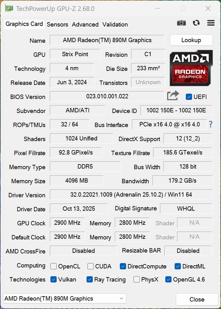 Sapphire Edge AI offre forti prestazioni iGPU con l'AMD Radeon 890M integrato. Il dispositivo ottiene buoni risultati nei benchmark sintetici e si posiziona a metà classifica. Il limite di potenza conservativo di 35 watt influisce in modo significativo sulle prestazioni 3D. L'iGPU conferma le sue elevate prestazioni anche nei test di gioco pratici. Contro la grafica integrata attualmente più veloce, l'AMD Radeon 8060S (ad esempio nel Bosgame M5 o GMKtec EVO-X2), tuttavia, la Radeon 890M non riesce a tenere il passo.