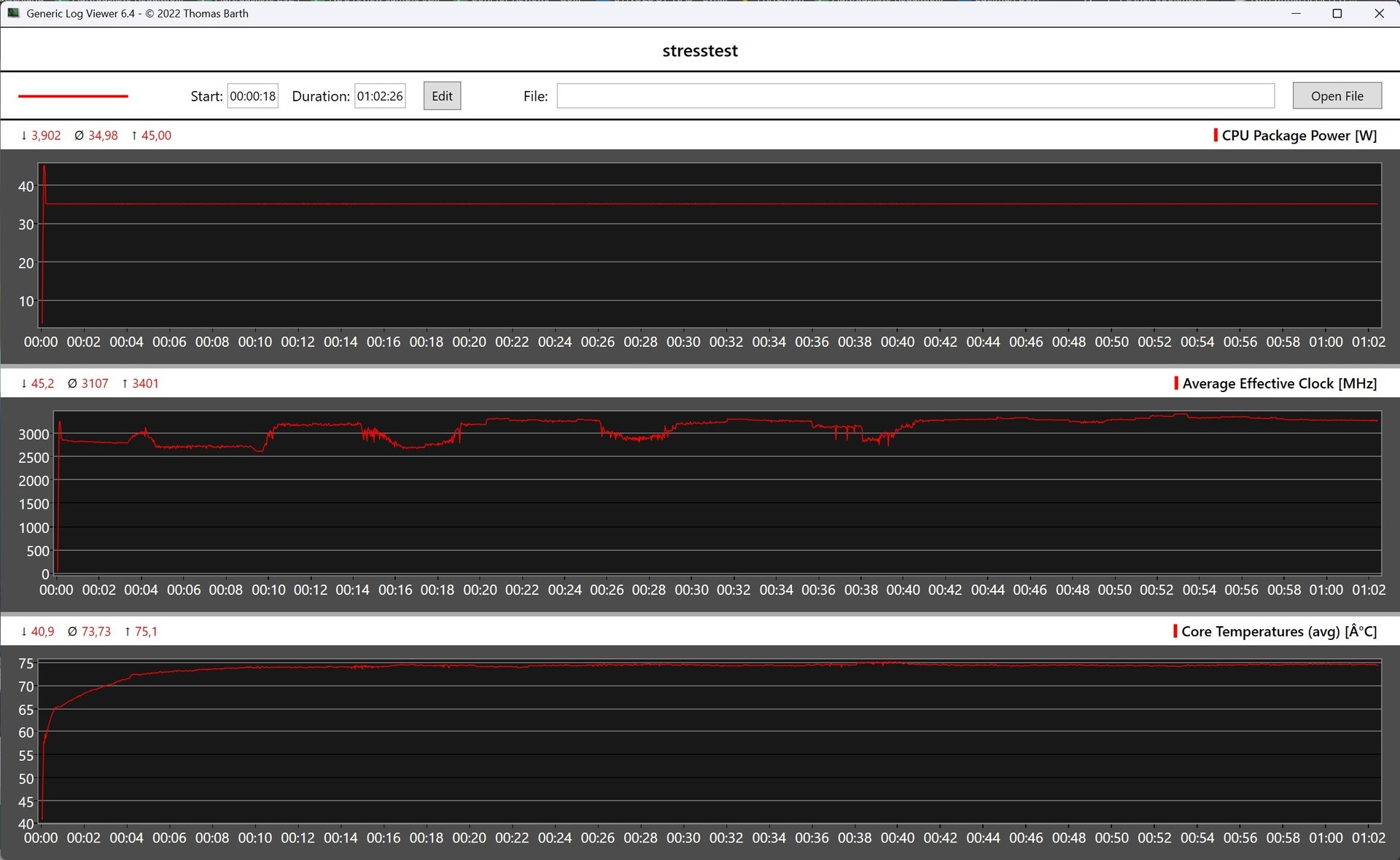 Il case di Sapphire Edge AI non dà nell'occhio sia in modalità idle che sotto carico. La parte superiore si riscalda leggermente di più rispetto alle altre aree, a causa del collegamento passivo dell'SSD. Nel test di stress, il Ryzen AI 9 HX 370 raggiunge brevemente circa 75 C, ma questo non è critico. I dati di telemetria mostrano che il sistema di raffreddamento può facilmente mantenere il TDP di 35 watt applicato in modo permanente.