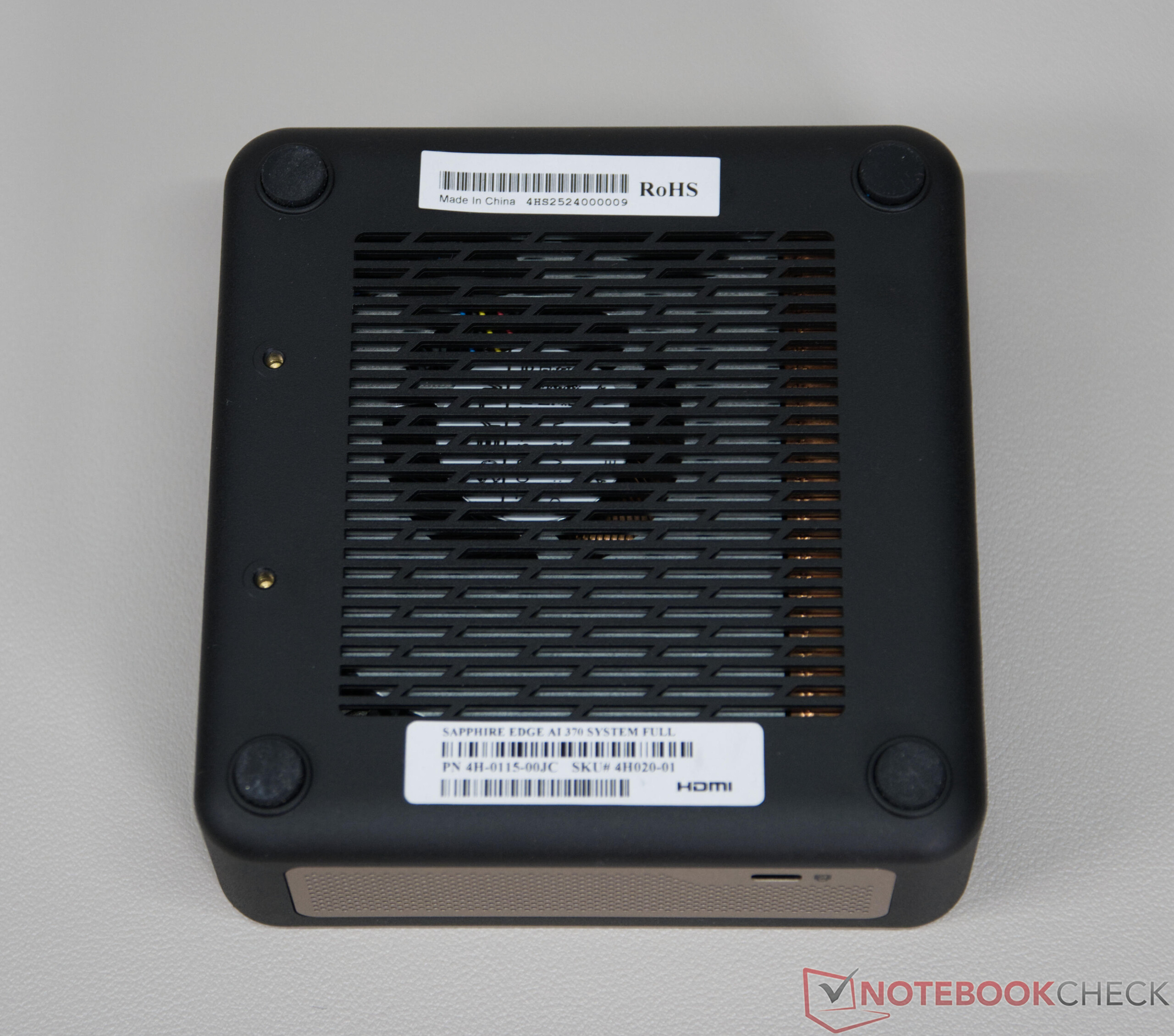 Il Sapphire Edge AI ha un case molto compatto che sembra di alta qualità grazie alla combinazione di colori nero e oro. A livello tattile, tuttavia, il Sapphire Edge AI non riesce a tenere il passo con lo chassis in metallo di alta qualità di concorrenti come il Geekom. Sapphire si affida a uno chassis in plastica lavorato in modo pulito, che si riflette anche nel peso ridotto.