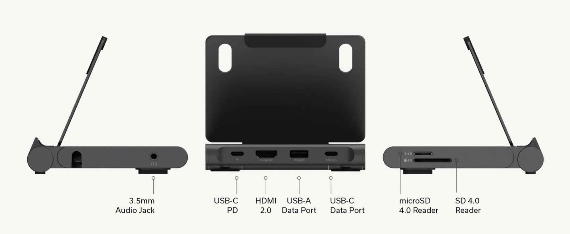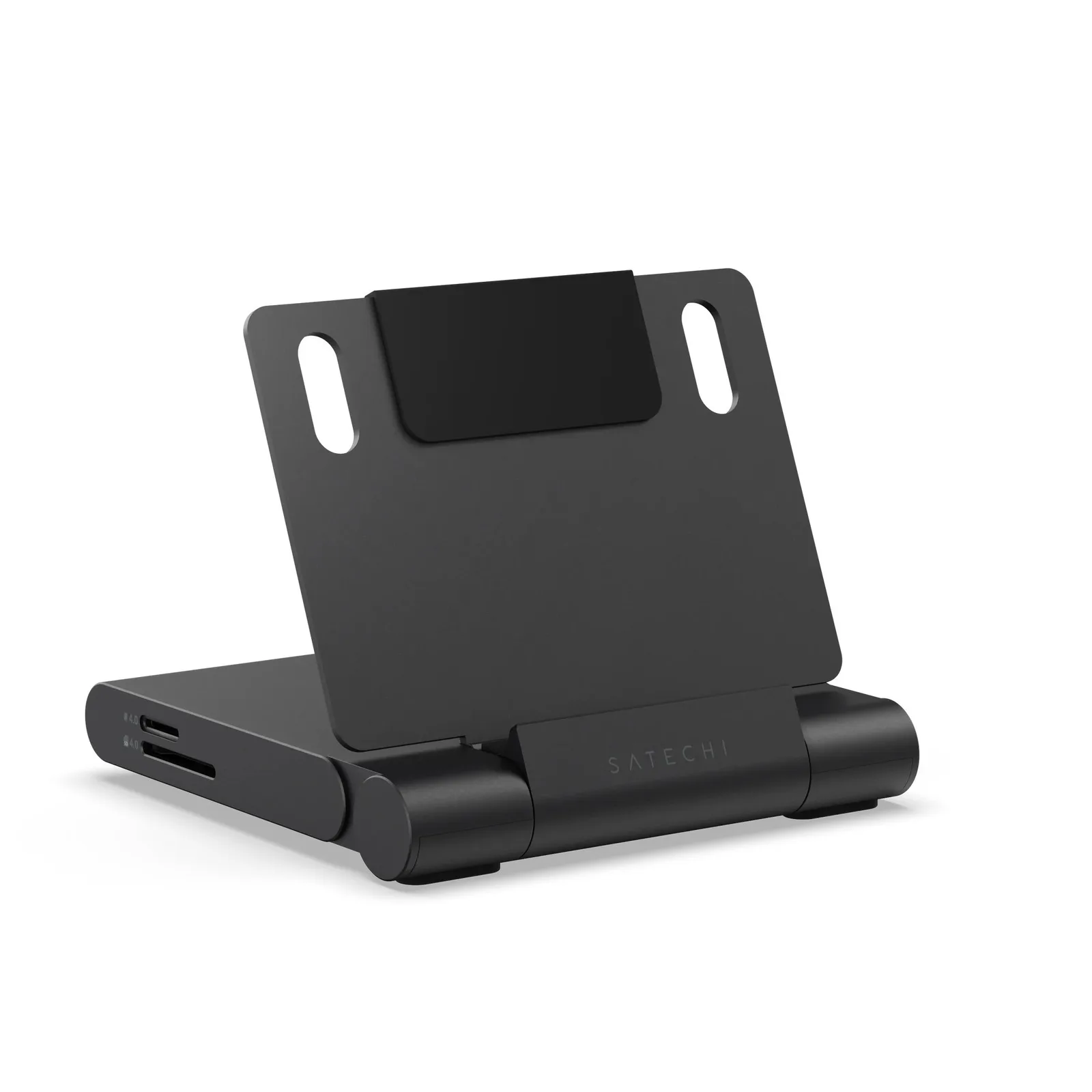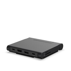 L'ultima docking station di Satechi con supporto integrato è progettata per la massima portabilità. Il supporto si ripiega facilmente, consentendo all'hub di essere trasportato comodamente nella tasca di una giacca o in uno zaino. Il supporto mantiene uno smartphone o un tablet in posizione verticale e, se utilizzato con una tastiera e un mouse, i tablet compatibili possono essere utilizzati comodamente come sostituti del laptop.
