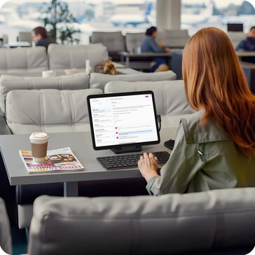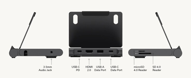 Il cavo USB-C utilizzato per collegare l'hub può essere riposto sul fondo del dispositivo per facilitarne il trasporto. Una volta collegato, l'hub espande le opzioni di connettività del tablet, includendo due porte USB-C, una delle quali può essere utilizzata anche per collegare un adattatore di corrente. C'è anche una porta USB-A e una porta HDMI per collegare un monitor o una smart TV. Un jack per cuffie da 3,5 mm si trova sul lato destro, mentre un lettore di schede SD e microSD si trovano sul lato sinistro