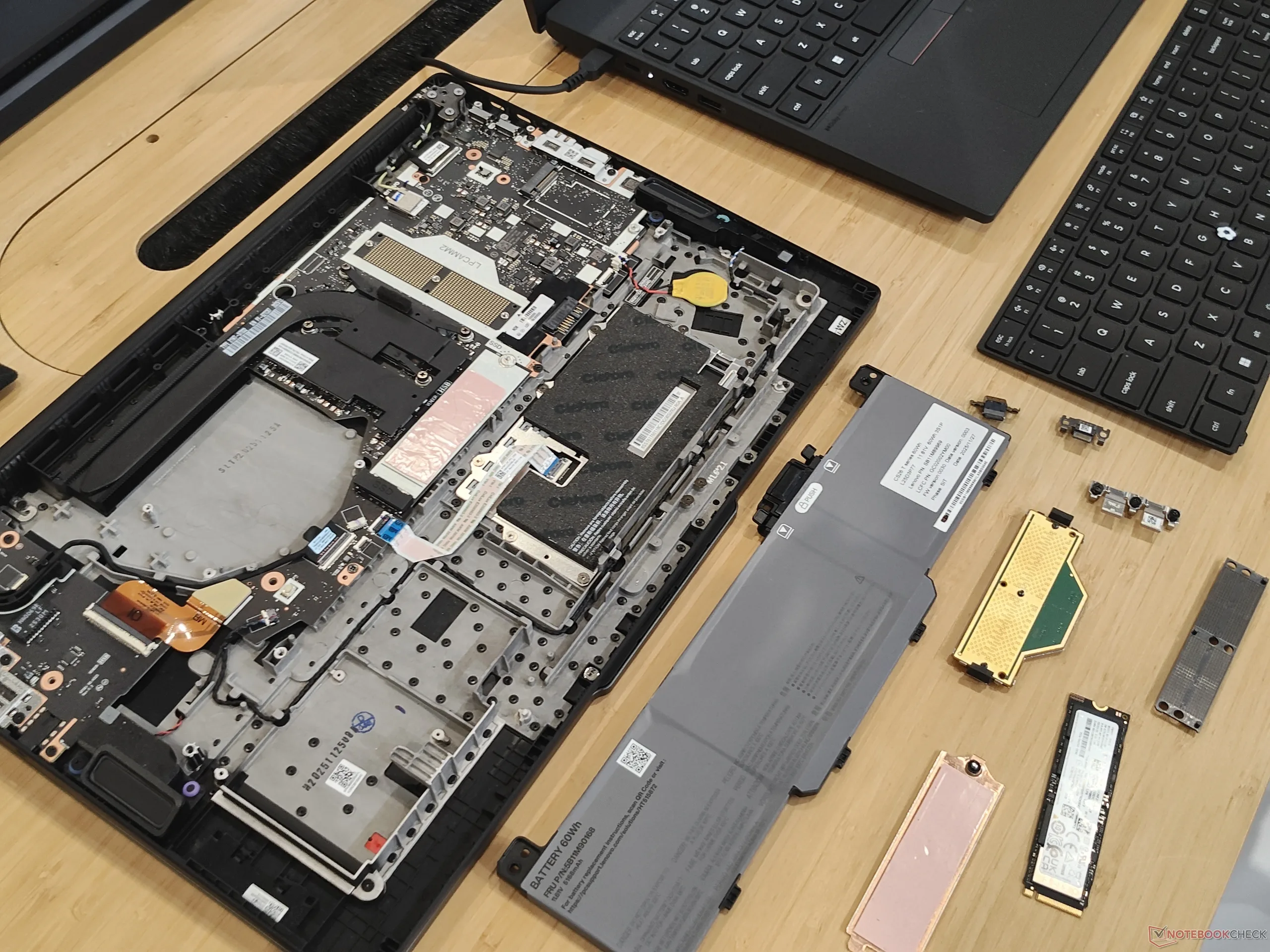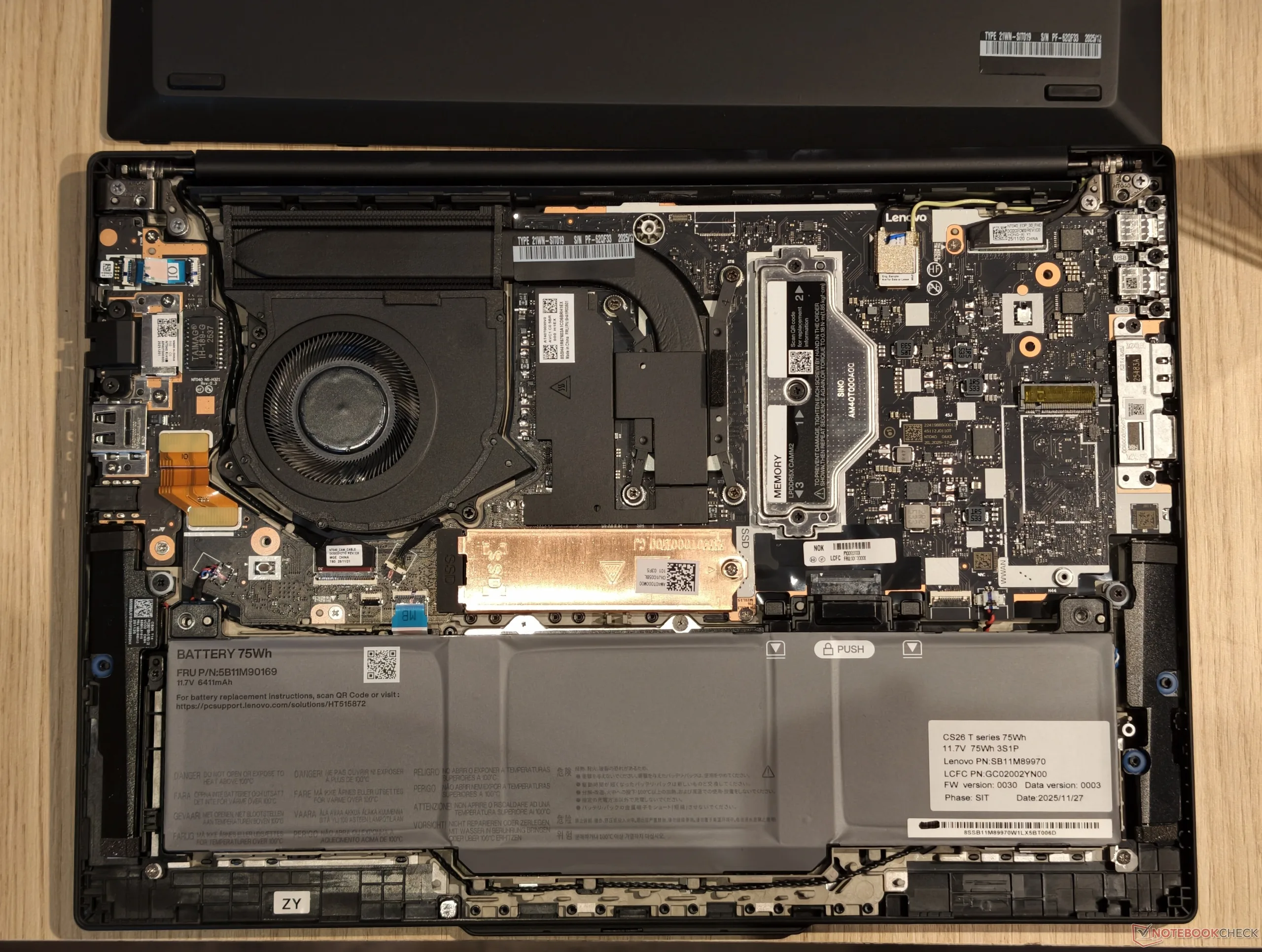Inoltre, le importantissime porte di ricarica USB-C sono ora modulari e sostituibili dall'utente. Lenovo si è persino spinta a rendere la ventola una parte separata dal dissipatore, consentendo agli utenti di pulire la ventola senza dover reincollare la CPU. E Lenovo ha pensato anche ad alcuni dettagli piacevoli: Una volta aperta l'ultima vite del coperchio inferiore, quella centrale tra le cerniere, il coperchio inferiore si stacca da solo nella sezione centrale, senza bisogno di un cacciavite. Nel complesso, non sorprende che il T14 Gen 7 e il T16 Gen 5 abbiano ottenuto un punteggio di 10/10 nel punteggio di riparabilità di iFixit.