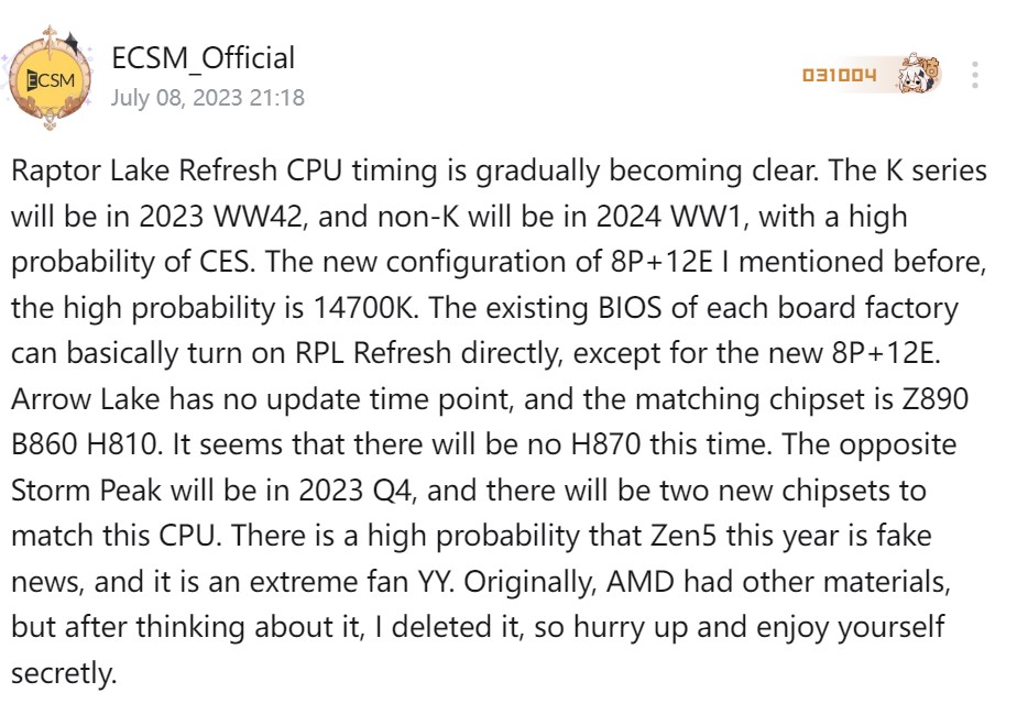 A partire dal Raptor Lake Refresh (RPL-R), Enthusiastic Citizen sostiene che Intel rilascerà le CPU standard della serie "K", come il Core i7-14700K, nella 42a settimana del 2023. Poiché la 42a settimana inizia il 16 ottobre e continua fino al 22 ottobre, possiamo vedere il lancio delle CPU RPL-R sbloccate a metà ottobre. Come riferimento, Intel ha lanciato i processori Raptor Lake di 13a generazione il 20 ottobre 2022, quindi le probabilità che il rapporto di Enthusiastic Citizen sia legittimo sono elevate.