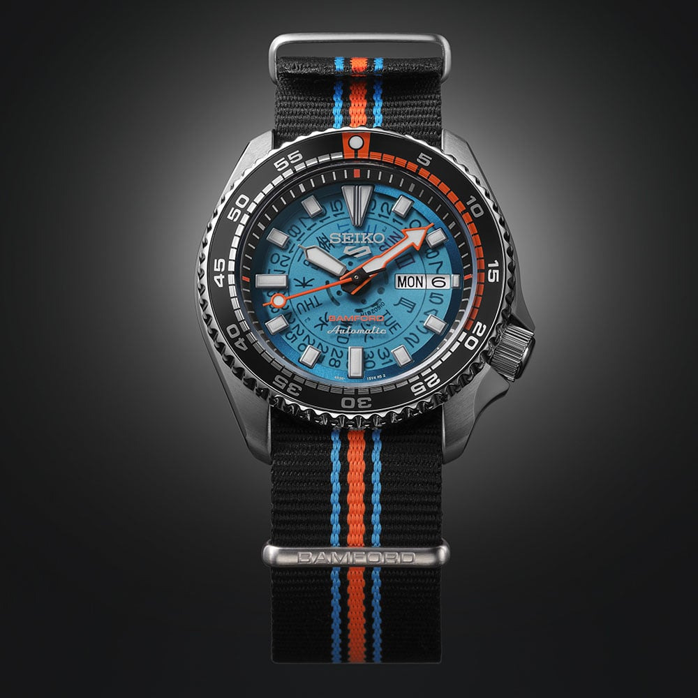 Questo modello in edizione limitata fa riferimento all'archivio della gamma Seiko 5 Sports "SKX" e sfoggia un tema "Retro Future" in tutto il suo design. Il quadrante scheletrato presenta diversi spunti luminosi (e non convenzionali) ispirati a Bamford, in particolare un quadrante verde acqua accentuato da audaci elementi arancioni, blu e bianchi sia sul quadrante che sul cinturino in nylon. Le lancette, gli indici e la lunetta sono trattati con LumiBrite. C'è un logo Bamford a ore 6, sul fondello e sul passante metallico personalizzato del cinturino. L'orologio ha un fondello trasparente con numeri di serie individuali.