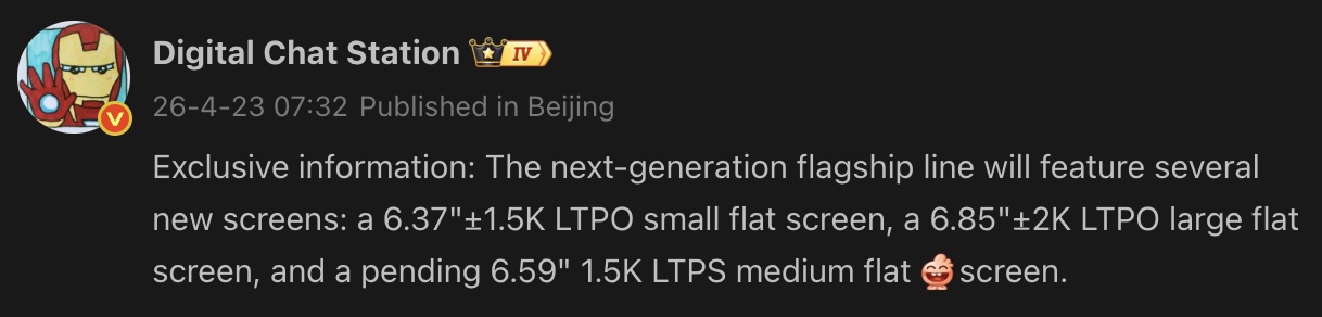 Secondo il tipster Digital Chat Station su Weibola serie Vivo X500 potrebbe includere un dispositivo con un display da 6,37 pollici. Si dice che sia dotato di un pannello LTPO con una risoluzione di 1.5K. L'informatore suggerisce che potrebbe trattarsi di Vivo X500 Pro. Come riferimento, ci sono voci di un Vivo X500 Pro Max anche.