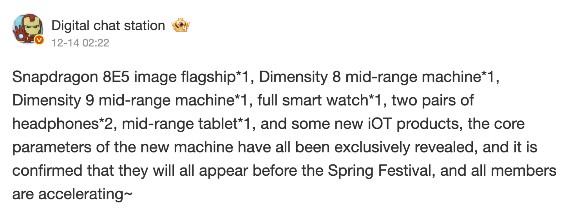 Nel frattempo, Digital Chat Station ha suggerito che Xiaomi 17 Ultra debutterà con gli smartphone di fascia media della serie Dimensity 8 e della serie Dimensity 9 al suo seguito. Come evidenzia lo screenshot qui sopra, si vocifera di uno smartwatch, di due paia di cuffie e di un tablet di fascia media, nonché di nuovi prodotti IoT.