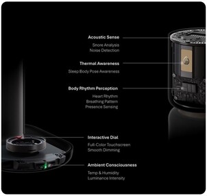 La manopola sulla base consente di accendere o abbassare la luminosità della lampada in qualsiasi momento. Tuttavia, nella parte superiore della lampada sono presenti diversi sensori, tra cui un microfono, che viene utilizzato per rilevare e analizzare il russare, tra le altre cose. Un termometro e un sensore di umidità sono progettati per valutare le condizioni ambientali che possono influire sul sonno. Infine, un radar mmWave è progettato per rilevare non solo i movimenti del corpo, ma anche la frequenza respiratoria valutando i movimenti del torace