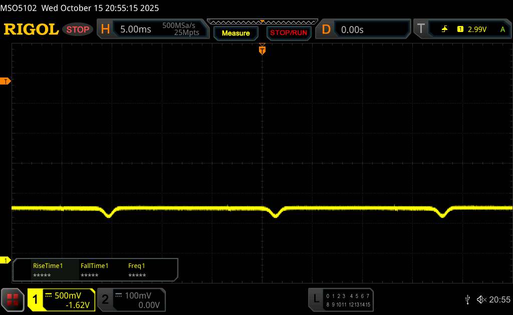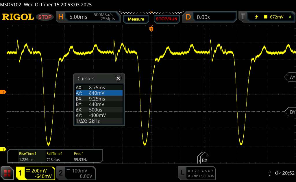 Come ci si aspetta da un pannello OLED, nell'oscilloscopio appare uno sfarfallio a bassa frequenza, a soli 60 Hz. Tecno lo attenua con una curva di ampiezza poco profonda e una regolazione PWM ad alta frequenza. Alla minima luminosità, abbiamo misurato 2.000 Hz. Anche se i problemi di sensibilità non possono essere esclusi completamente, sono improbabili.