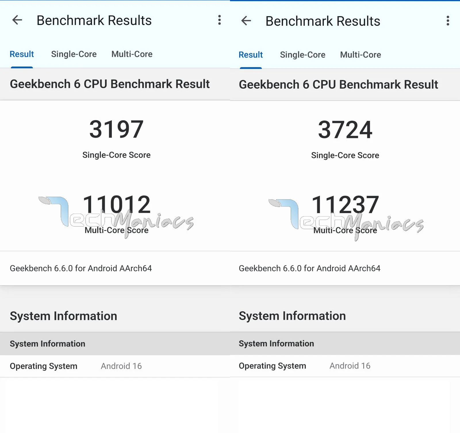 Ciò che è piuttosto interessante è che, rispetto al Galaxy S26 con Exynos 2600, c'è una notevole differenza nel punteggio single-core. Come mostra lo screenshot condiviso da TechManiacs mostra che il telefono con Exynos ottiene 3.197 punti in single-core e 11.012 in multi-core.