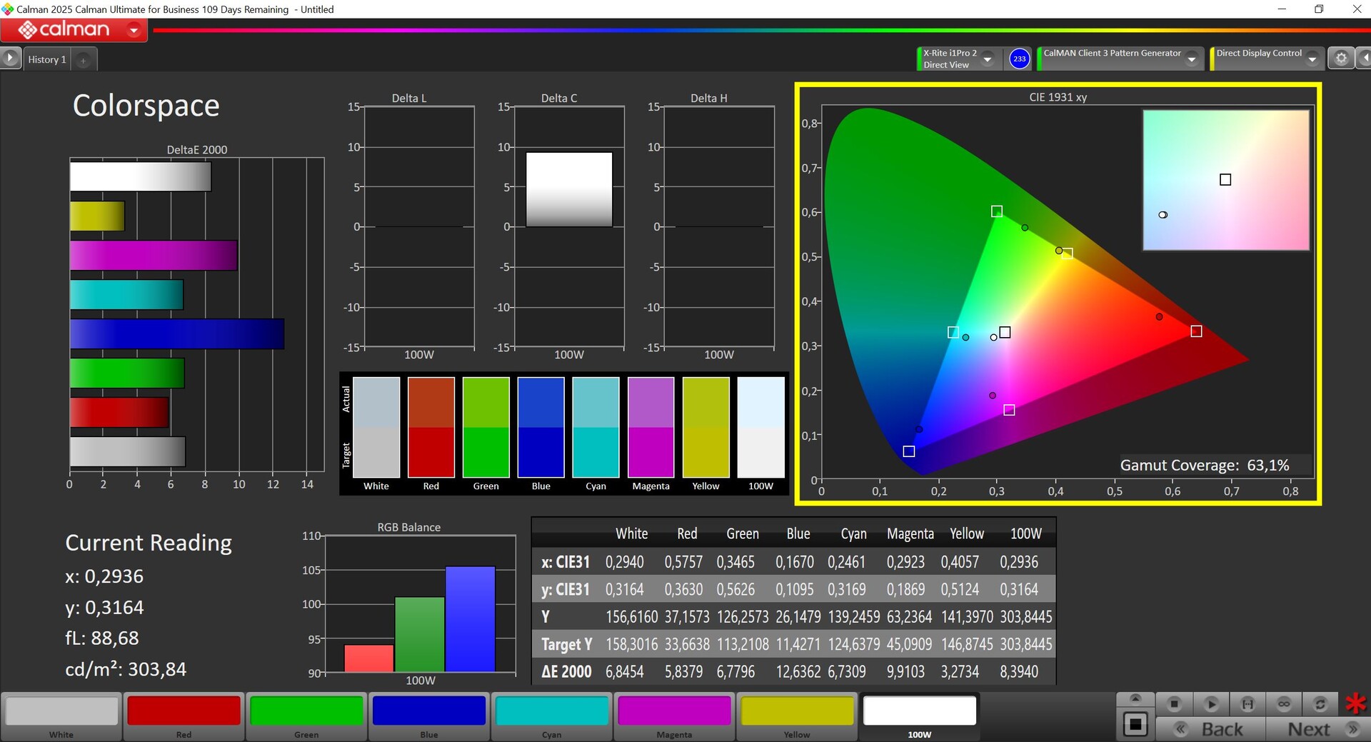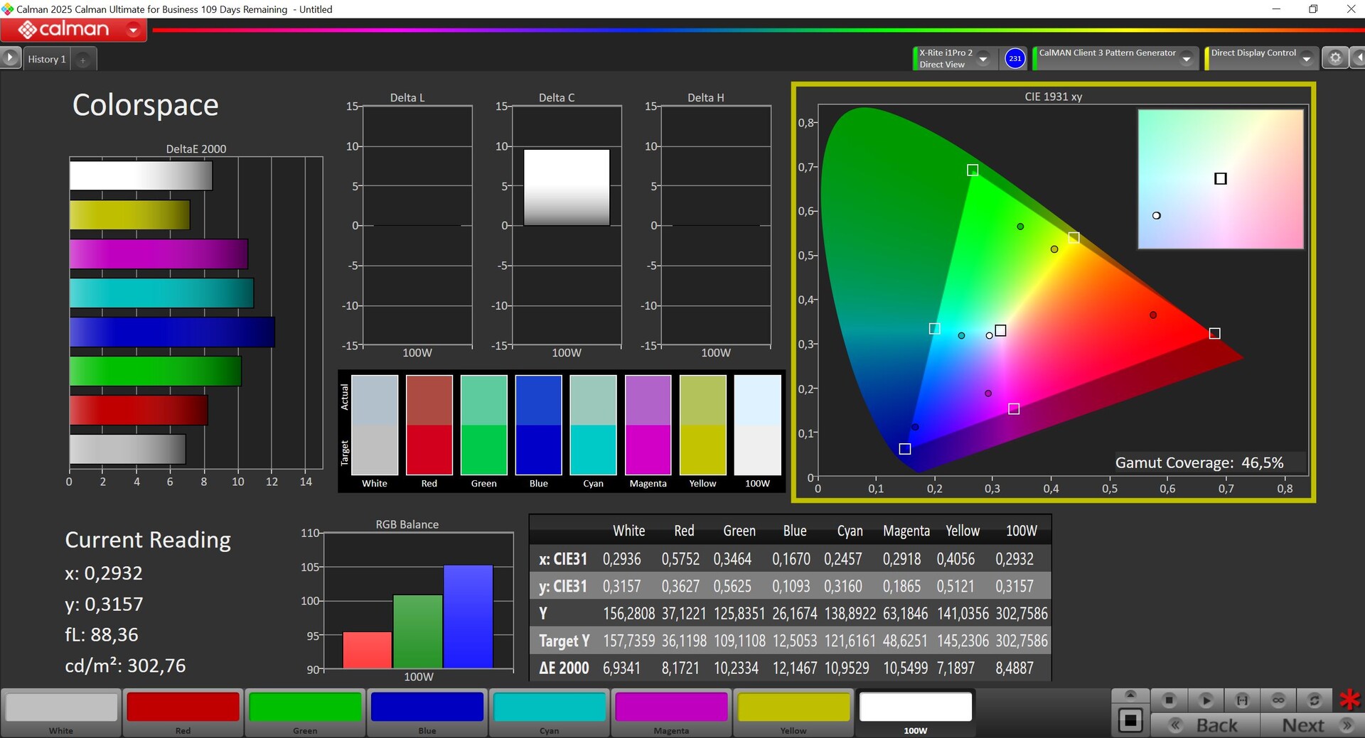La luminosità è di 300 cd/m2 e il valore del nero è un buon 0,26 cd/m2, per cui il contrasto è ancora un ragionevole ∼1.200:1. Questo è sufficiente per l'uso in interni, ma anche le superfici luminose non mostrano problemi in termini di immagini sgranate. Questo è sufficiente per l'uso in interni, ma è difficile lavorare comodamente in ambienti molto luminosi o all'aperto. La copertura dello spazio colore è molto bassa e anche il profilo di fabbrica non è particolarmente accurato. Oltre a un'evidente proiezione del blu e a una temperatura del colore troppo fredda, si riscontrano anche deviazioni cromatiche significative. Il pannello non è adatto all'editing di immagini.