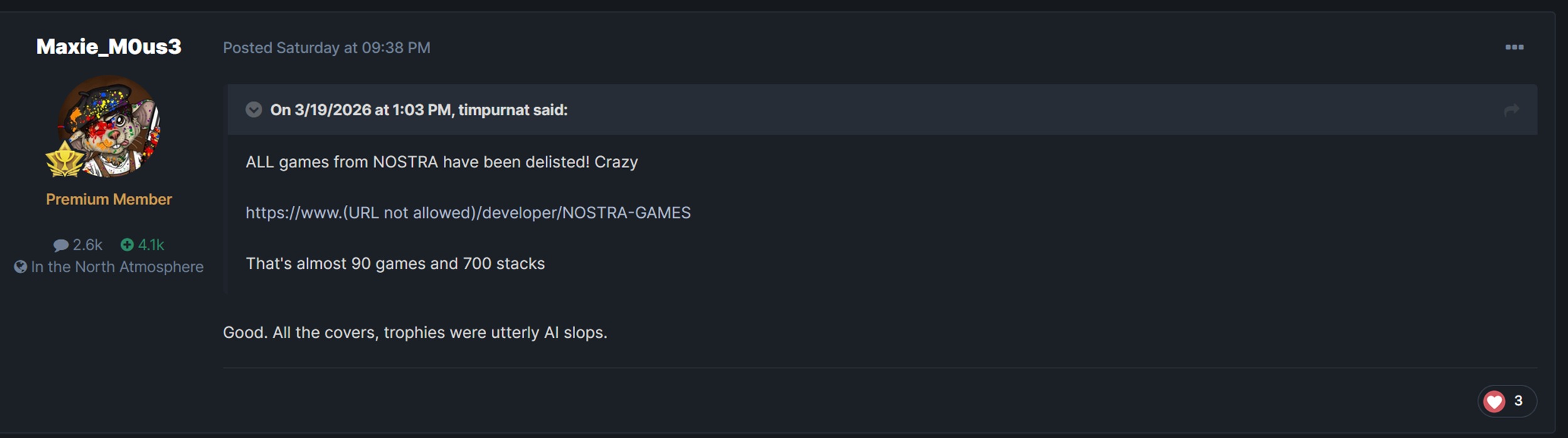 Considerando le variazioni regionali, Nostra Games ha visto scomparire 700 giochi. Come riporta il sito Delisted Games l'azienda ha risposto alla notizia su Discord. Ha confermato di non aver avuto alcun preavviso, ma di avere intenzione di continuare a rilasciare titoli sull' Nintendo eShopxbox e Steam.