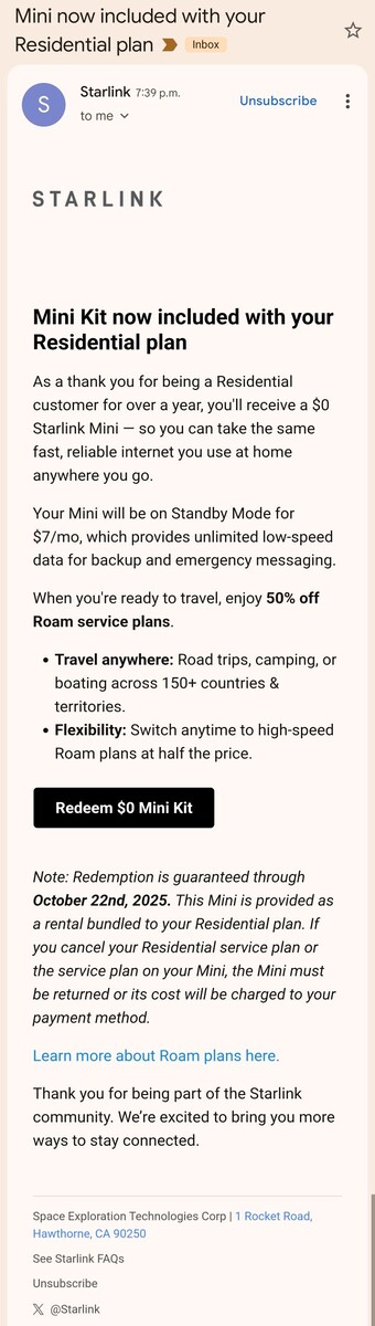 I fortunati abbonati a Residential che hanno ricevuto l'e-mail potranno richiedere una parabola Starlink Mini senza alcun costo aggiuntivo. Tutto ciò che deve fare è cliccare sul pulsante "Riscatta $0 Mini Kit" nell'e-mail, confermare l'ordine e la parabola sarà consegnata al suo indirizzo. SpaceX fa notare che il link di riscatto è valido fino al 22 ottobre. Inoltre, l'e-mail menziona anche che gli utenti otterranno uno sconto del 50% sui piani Roam, il che significa che dovrà pagare solo 82,5 dollari per il piano Roam Unlimited e 25 dollari per Mini Roam. Di solito, questi piani costano rispettivamente $165 e $50. Non è chiaro se la tariffa scontata sia valida solo per i primi mesi del servizio o se sia un vantaggio permanente per gli utenti residenziali idonei.