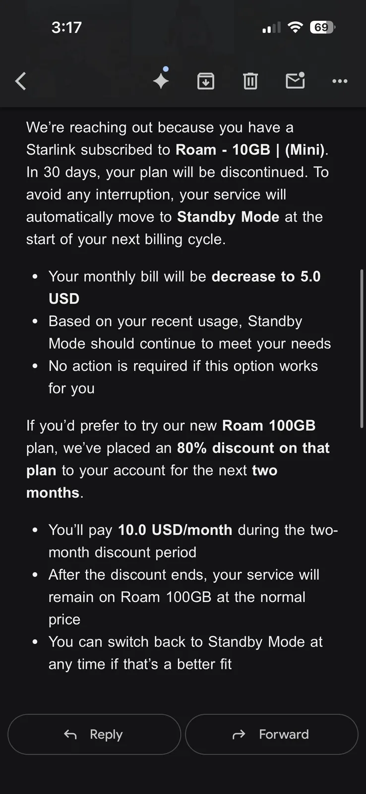 Oltre al piano da 10 dollari, Starlink ha recentemente cessato di offrire anche il piano da 40 dollari al mese che era il suo piano Residenziale più economico e l'ha spostato nel piano Roam ma solo per alcuni utenti. Successivamente è stato rimosso del tutto, mentre Starlink ha ha raddoppiato l'assegnazione di base di 50 dollari al mese per i dati in roaming e ha ridotto il prezzo della parabola Mini del 20% come compensazione.