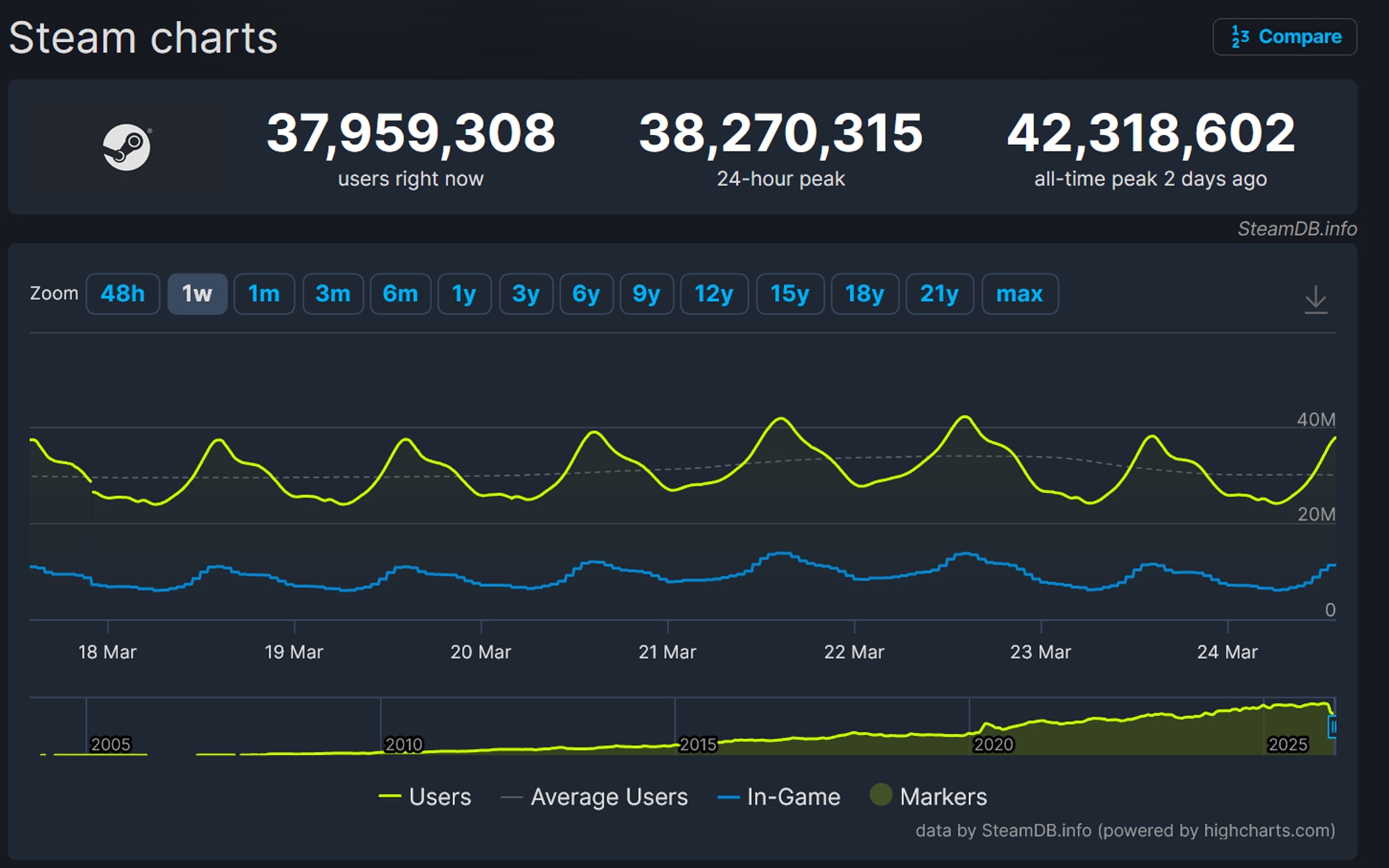 Mentre il conteggio dei giocatori nei giochi Steam tendono a ricevere la maggiore attenzione, Steam Charts e SteamDB misurano altre metriche. Il conteggio degli utenti contemporanei mostra quanti giocatori sono connessi al client di Valve, anche quando non sono immersi nel gioco. Potrebbero sfogliare il negozio o utilizzare le funzioni della comunità che mantengono i fan impegnati nell'ecosistema.