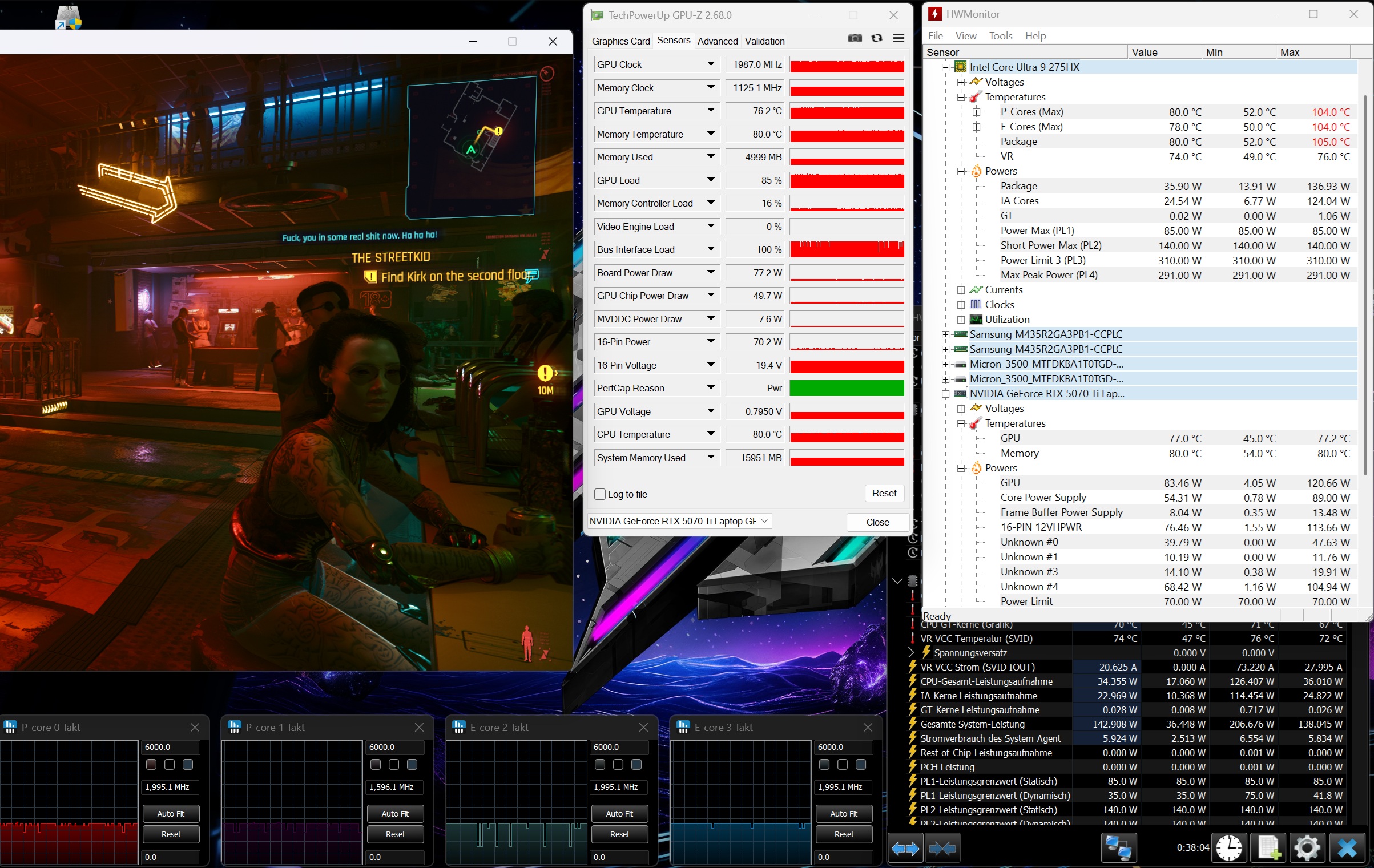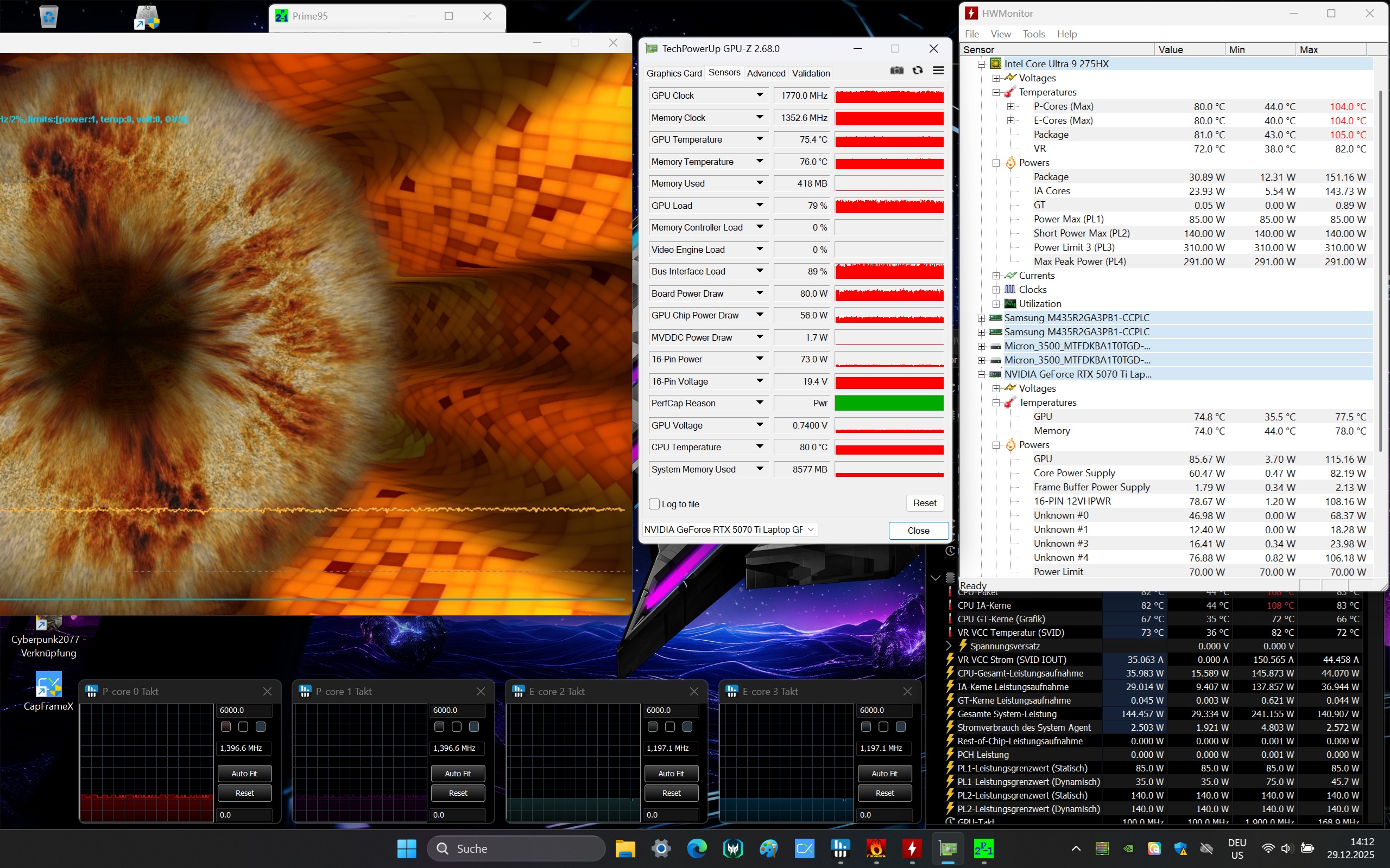 Nel test di stress con gli strumenti Furmark e Prime95, la CPU in particolare ha sudato parecchio. Dopo aver superato brevemente i 100 °C, la temperatura si è stabilizzata a 80 °C. Nel frattempo, la GPU si è stabilizzata a circa 75 °C.