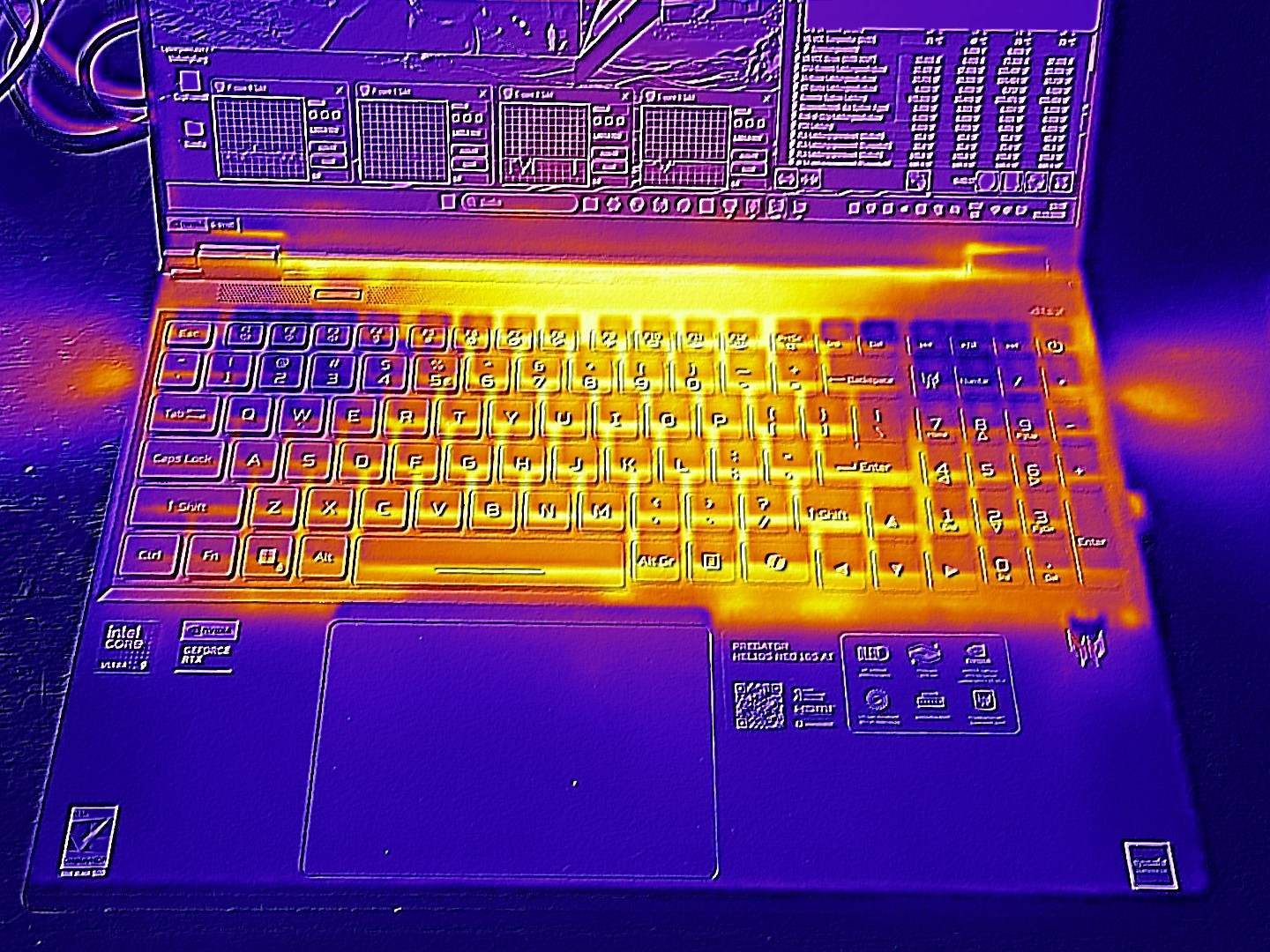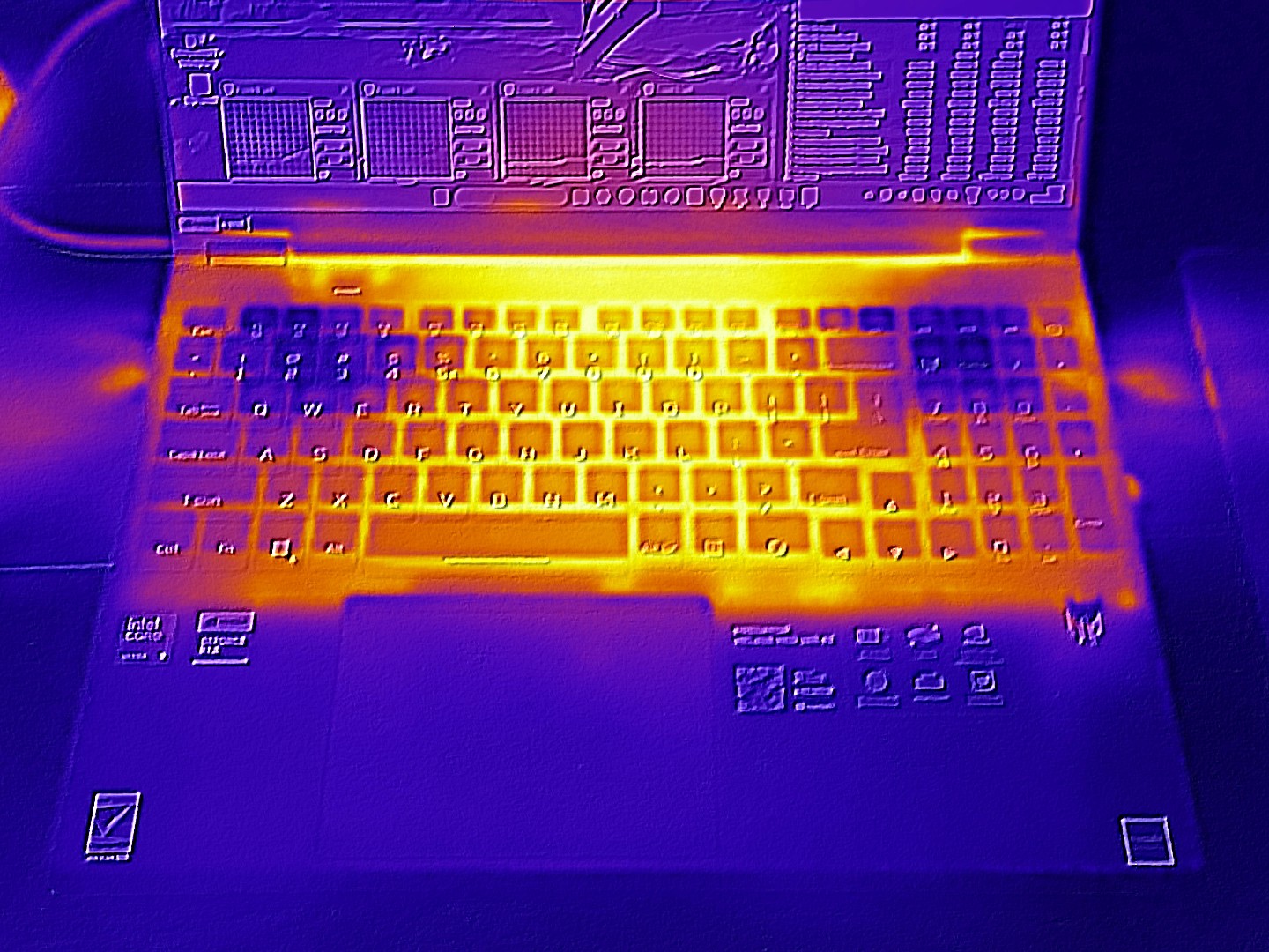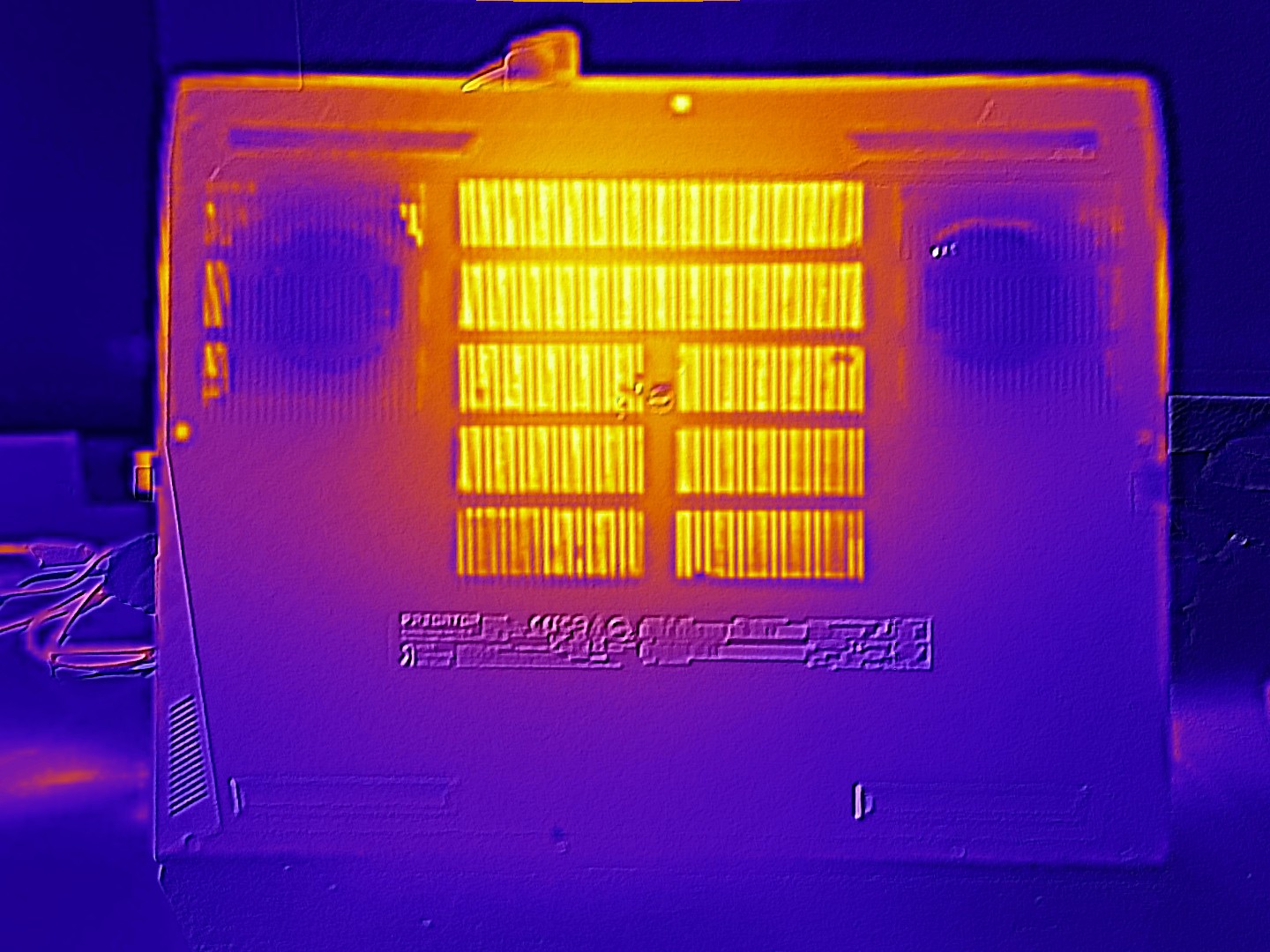 La conclusione sullo sviluppo della temperatura è simile. Finché il notebook è al minimo, le superfici rimangono piacevolmente fresche e si mantengono al di sotto dei 30°C. In modalità 3D, la parte inferiore del case, in particolare, raggiunge temperature molto più elevate: un massimo di 55 °C mette in discussione le sessioni di gioco sulle gambe. La temperatura nella parte superiore è più moderata, con un massimo di 47 °C.