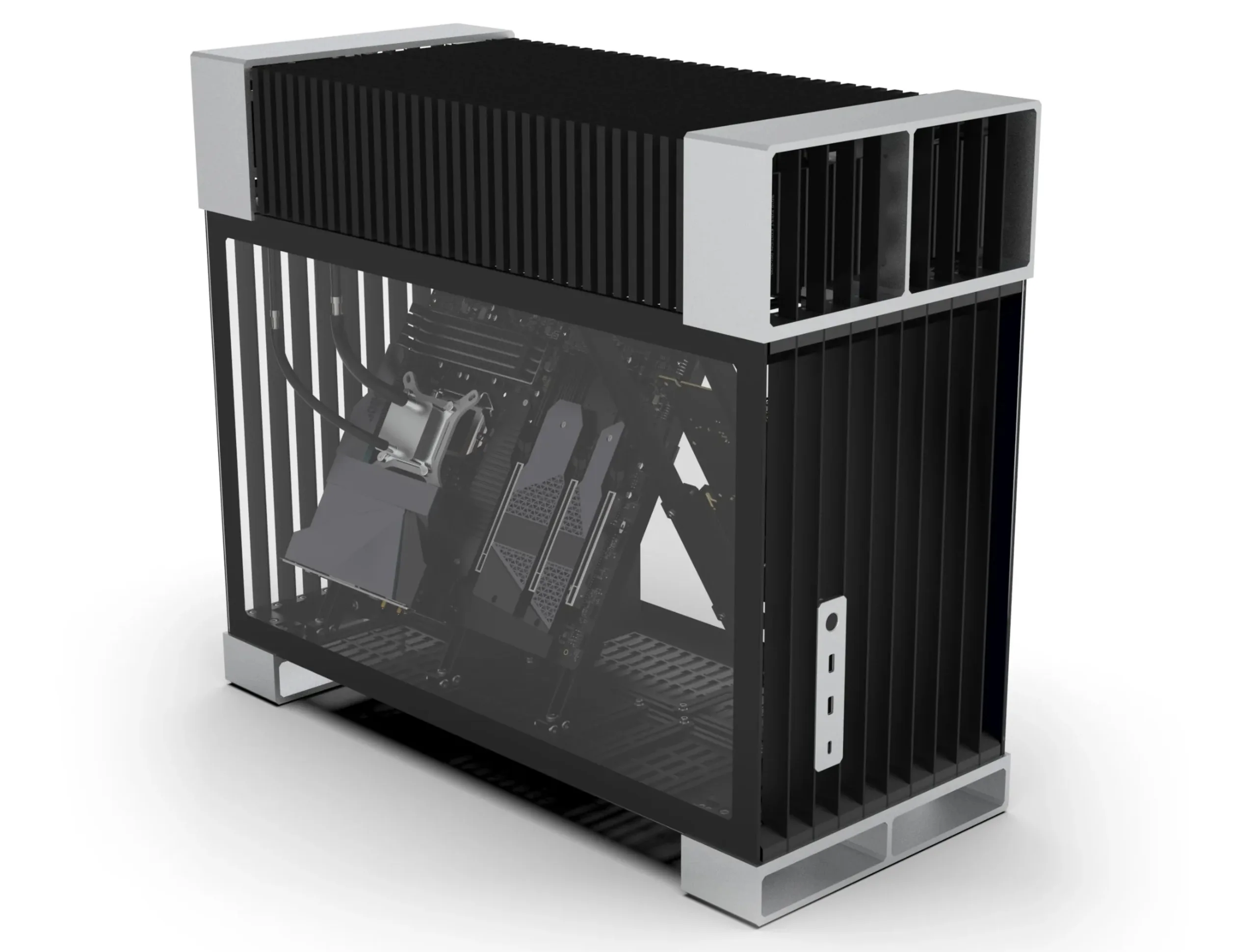 La scheda madre e la GPU sono montate in diagonale in direzioni opposte, formando un design a X. Gli utenti dovranno rimuovere da soli i dissipatori della GPU e montare la piastra fornita con i tubi. Streamcom raccomanda PCB GPU non più lunghi di 280 mm. Con dimensioni di 608 x 268 x 520 mm, il case è realizzato in acciaio e alluminio e pesa 15 kg. Una caratteristica interessante è rappresentata dalle estensioni I/O che possono essere posizionate in qualsiasi punto dei lati posteriore e anteriore.