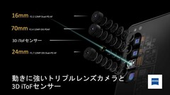 | Fotocamera posteriore | Wide: 12 MP, f/1.7, 24mm Tele: 12 MP, f/3.4, zoom opt 3x, 70mm Ultrawide: 12 MP, f/2.6, 16mm ToF: 0.3 MP |
