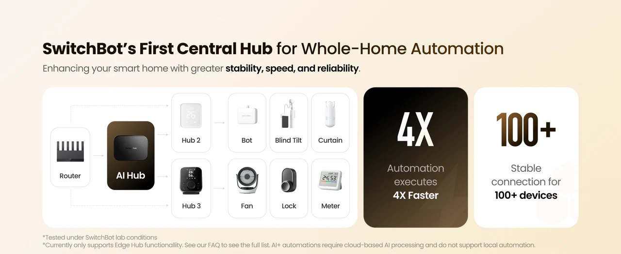 Secondo SwitchBot, sono presenti diverse funzioni AI, tra cui il riconoscimento di volti, animali domestici e oggetti per i feed delle telecamere in diretta. Sono supportate anche le automazioni VLM locali, che consentono di controllare un attuatore in base a un oggetto riconosciuto. Come esempio, SwitchBot menziona l'accensione di una luce quando una persona è sdraiata sul divano. È possibile riconoscere diversi comportamenti e attivare routine intelligenti. L'hub per la casa intelligente è pubblicizzato con una prestazione AI di 6 TOPS.