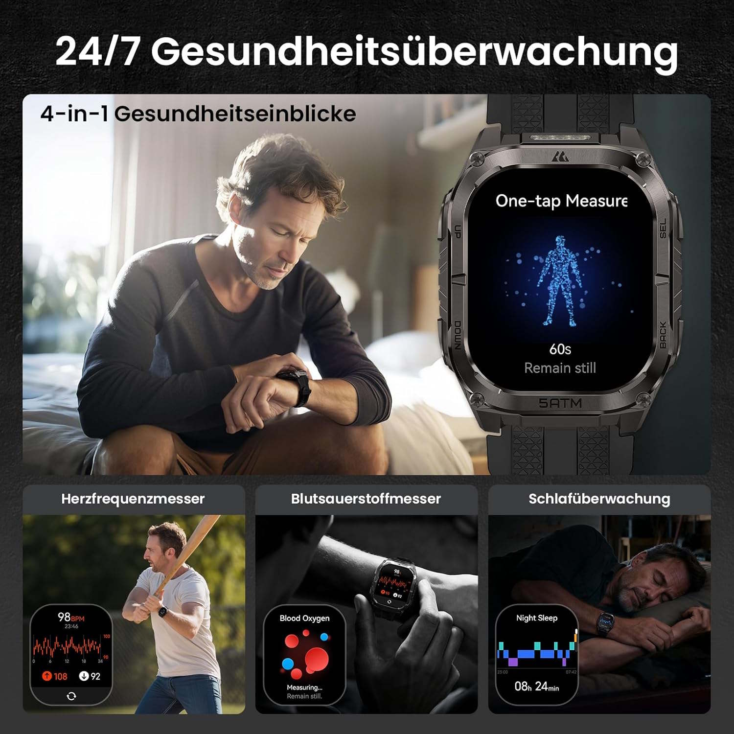 Quando uno smartphone è associato, le notifiche possono essere visualizzate sullo smartwatch. Il Tank M4C può anche funzionare come dispositivo Bluetooth vivavoce, quindi non è necessario sollevare il telefono per rispondere a una chiamata. I LED per la funzione torcia si trovano sulla parte superiore e possono essere regolati in diversi livelli. Secondo Kospet, l'orologio è realizzato con una quantità relativamente elevata di acciaio inossidabile e metalli in generale. Per essere più precisi, la cassa dell'orologio è realizzata in una lega di zinco, mentre la plastica è utilizzata per il retro.
