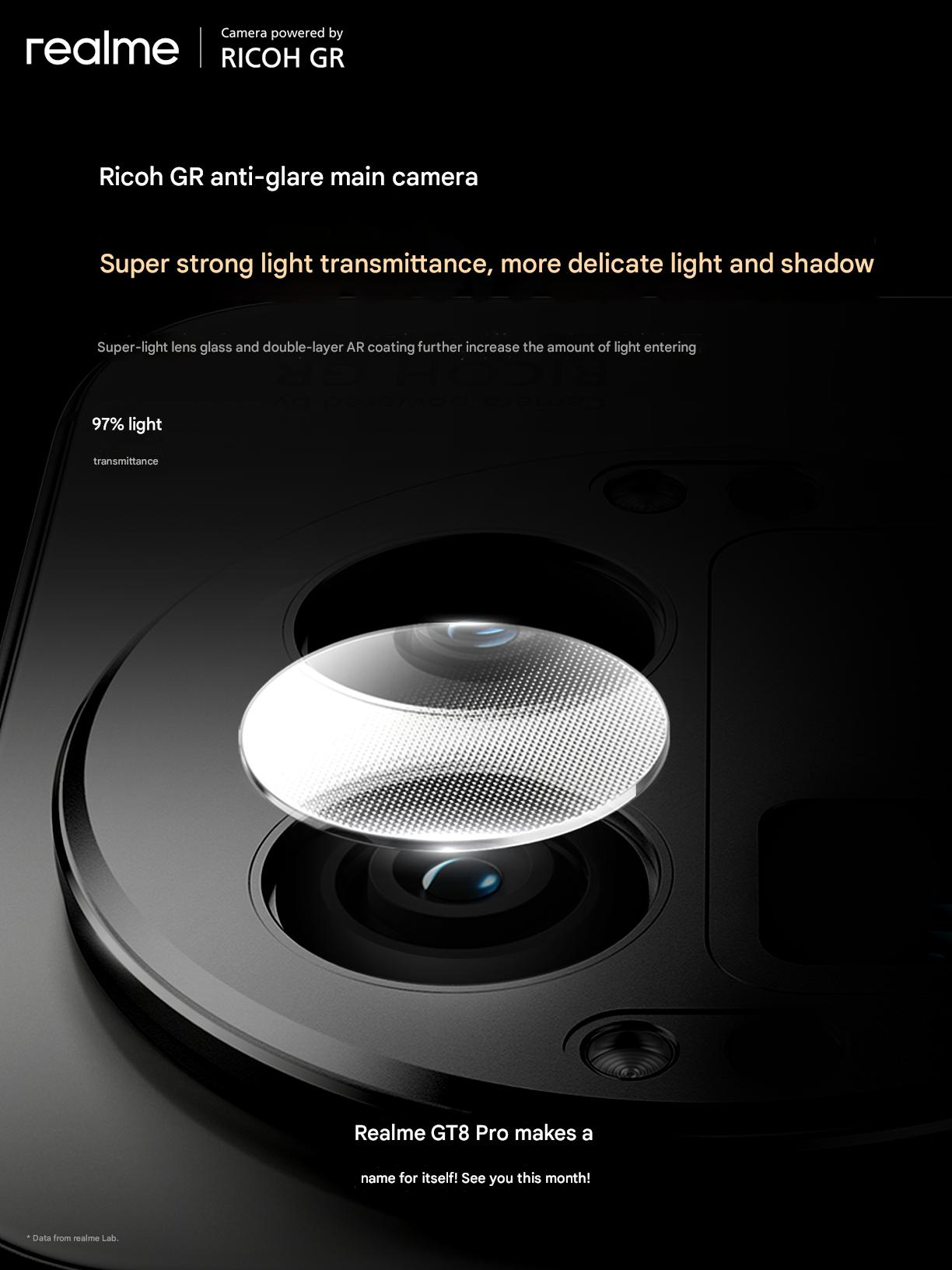 È probabile che la fotocamera principale del Realme GT8 Pro conservi un obiettivo da 23 mm, pur offrendo la possibilità di passare a 28 mm o 40 mm (introdotti nella Ricoh GR IIIx) tramite l'app fotocamera. Queste due lunghezze focali sono particolarmente adatte alla fotografia di strada, un settore in cui Ricoh GR ha tradizionalmente una notevole autorità. Sarà inclusa anche una modalità mirino. Nei teaser ufficiali condivisi di recente su Weibo e Xrealme ha rivelato che GT8 Pro è dotato di un obiettivo "antiriflesso" - simile al rivestimento Zeiss T* presente sulle ammiraglie Vivo - per ridurre gli artefatti indesiderati, come i riflessi, e offrire scatti dettagliati e vibranti