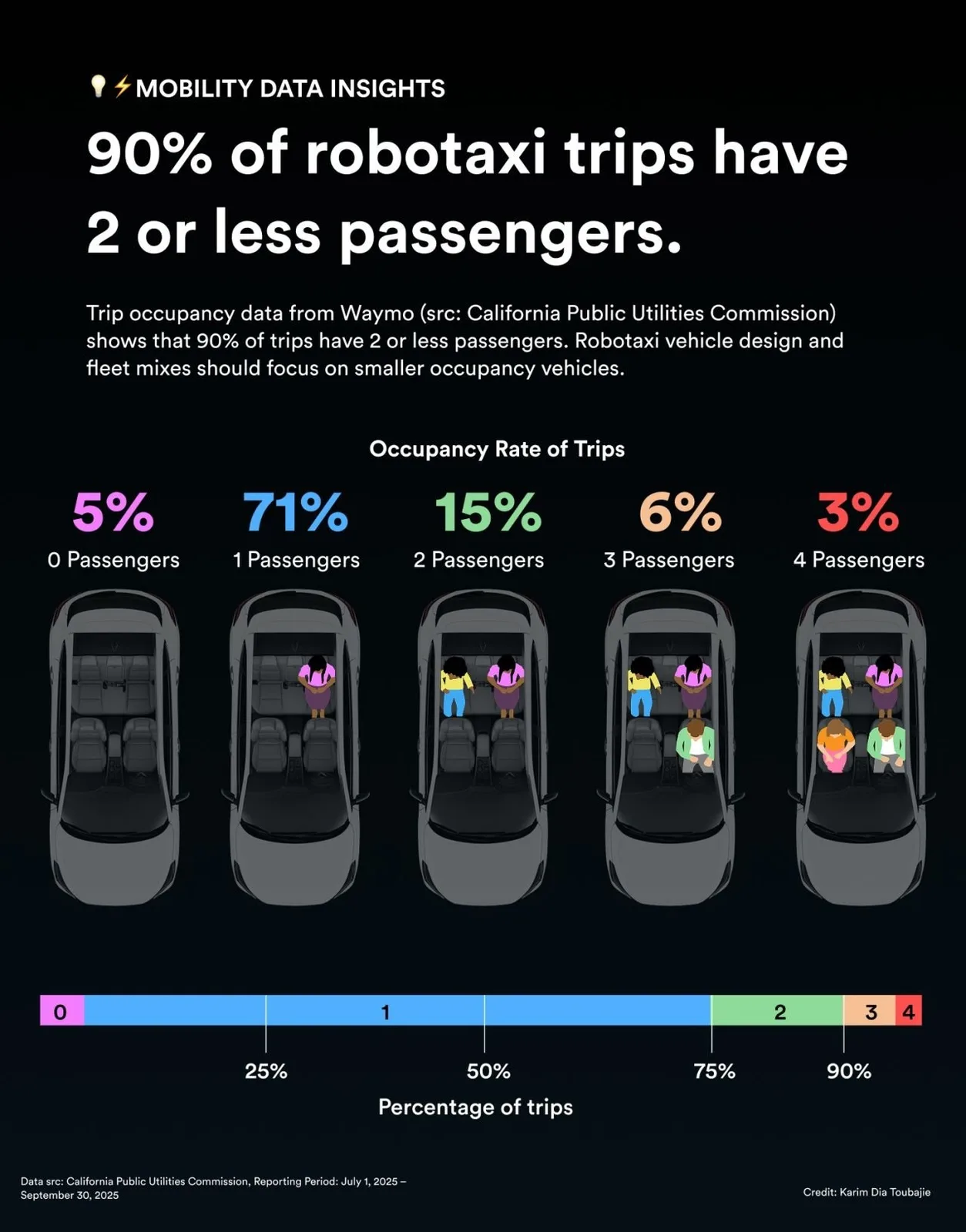 Il concept a due posti è stato ora confermato dalle ultime statistiche sui tassi di occupazione di Waymo. Risulta che il 90% dei viaggi senza conducente in un robotaxi viene effettuato con una o due persone. La stragrande maggioranza di questi viaggia con una sola persona, mentre solo il 9% include almeno una persona sui sedili anteriori.