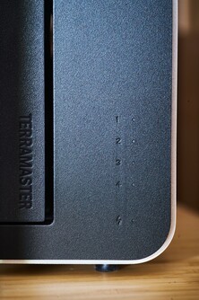 Il nuovo TerraMaster F4-425 Plus assomiglia al modello F4-425, ma con uno chassis in metallo e un logo TerraMaster più piccolo. L'involucro in alluminio non solo ha un aspetto più pregiato, ma aumenta anche il peso da 2,1 a 2,9 chilogrammi. La qualità costruttiva è eccellente, anche se i vassoi dei dischi rimangono in plastica e anche il pannello posteriore è in plastica. Mancano in particolare i LED di stato per le unità SSD M.2, per cui un'unità SSD guasta può essere rilevata solo tramite il software.