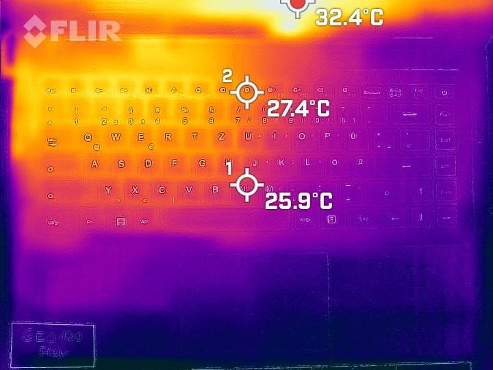 Il convertibile può convertire un massimo di 24 watt di potenza. Questa bassa potenza provoca comunque un notevole riscaldamento delle superfici del portatile. Abbiamo misurato fino a 48 °C (118,4 °F) sul lato inferiore. Poiché una piastra di rame relativamente grande dissipa il calore del processore, il case non solo è caldo in alcuni punti, ma quasi un quarto del lato inferiore del GeoFlex 140 può sviluppare una temperatura fastidiosamente elevata.