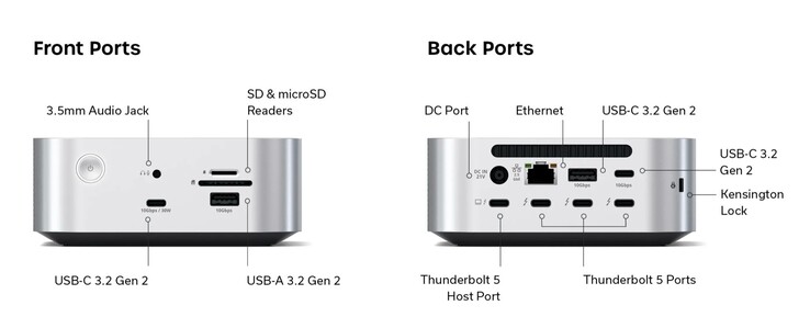 La docking station si collega tramite Thunderbolt 5 con una larghezza di banda di 120 Gbps e può ricaricare i computer portatili tramite lo stesso cavo con un massimo di 140 watt. Il dock è anche compatibile con i Mac che supportano solo Thunderbolt 4, anche se con prestazioni ridotte. Sulla parte anteriore del dock, c'è una porta USB-C che può ricaricare i dispositivi fino a 30 watt e trasferire dati a 10Gbps. Inoltre, la parte anteriore presenta un jack per cuffie da 3,5 mm, una porta USB-A e un lettore di schede SD e microSD.