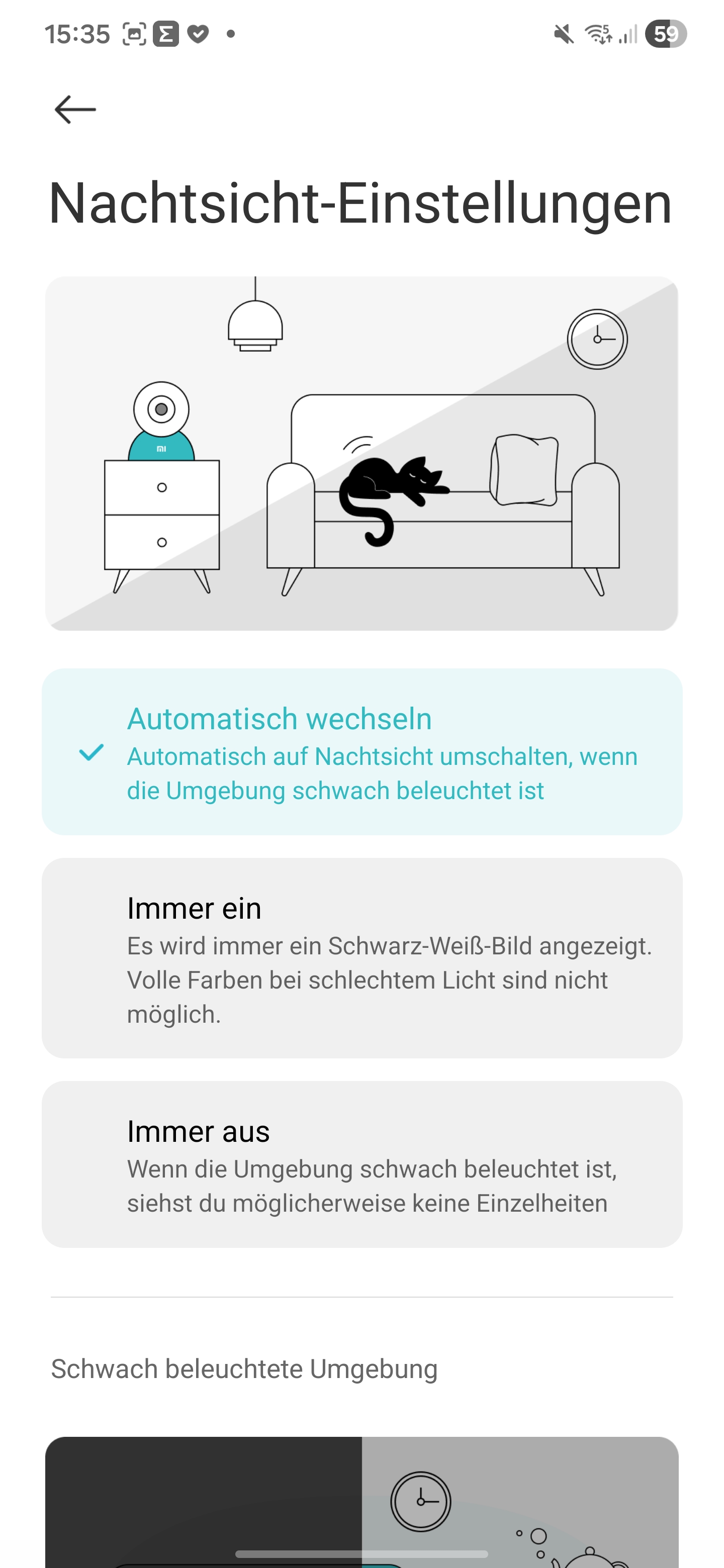 Nei test, la telecamera ha rilevato in modo affidabile le persone e ha seguito i loro movimenti, sia di giorno che di notte. Se lo desidera, l'app Mi Home può inviare notifiche push quando viene rilevato un nuovo movimento. La visione notturna funziona in modo affidabile, ma contrariamente a quanto dichiarato dal produttore, non siamo riusciti a vedere alcun colore in condizioni di scarsa illuminazione.