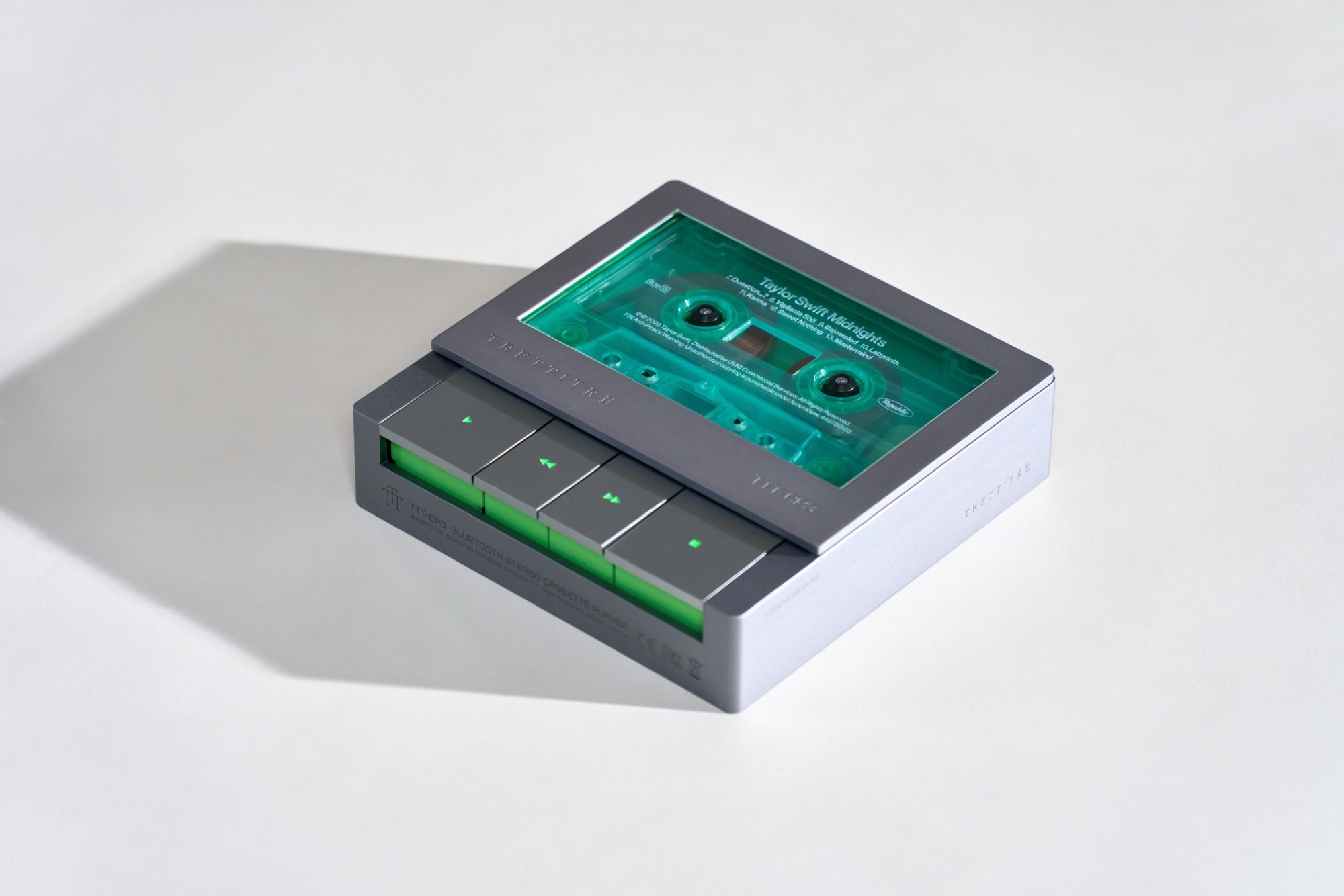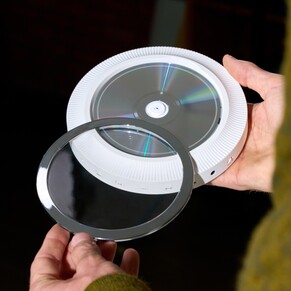Anche il lettore CD compatto è dotato di una batteria, la parte anteriore rotonda può essere girata lateralmente per cambiare il CD. Un piccolo display OLED mostra i dettagli sulla riproduzione e sulla batteria. Come il lettore di cassette, il lettore CD si ricarica tramite USB-C, tutti i componenti hanno un alloggiamento in metallo di alta qualità e offrono Bluetooth e AUX
