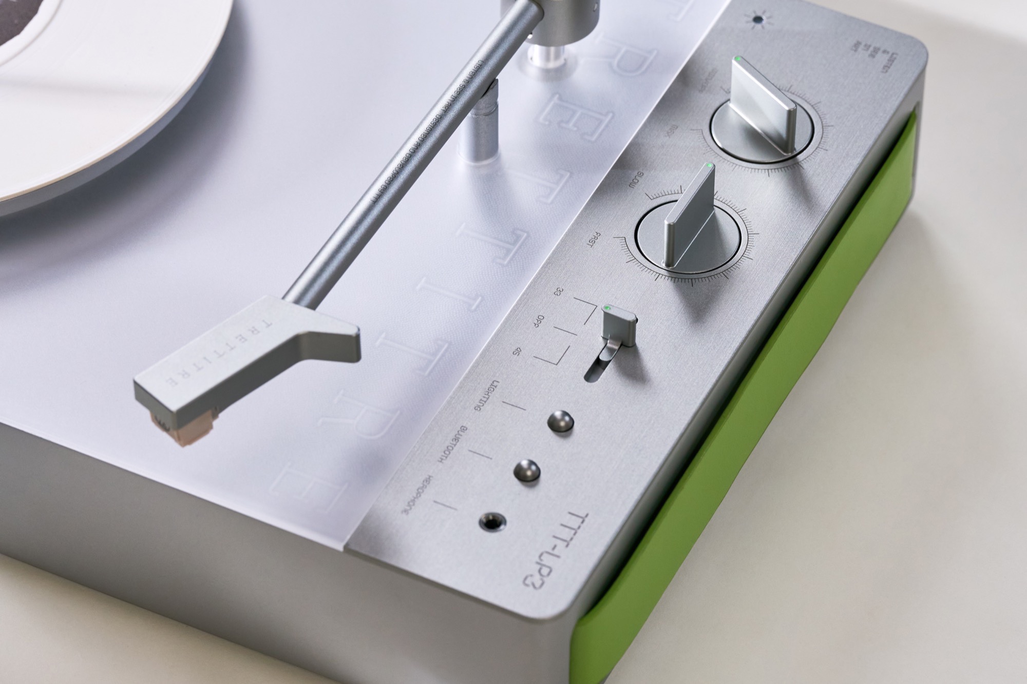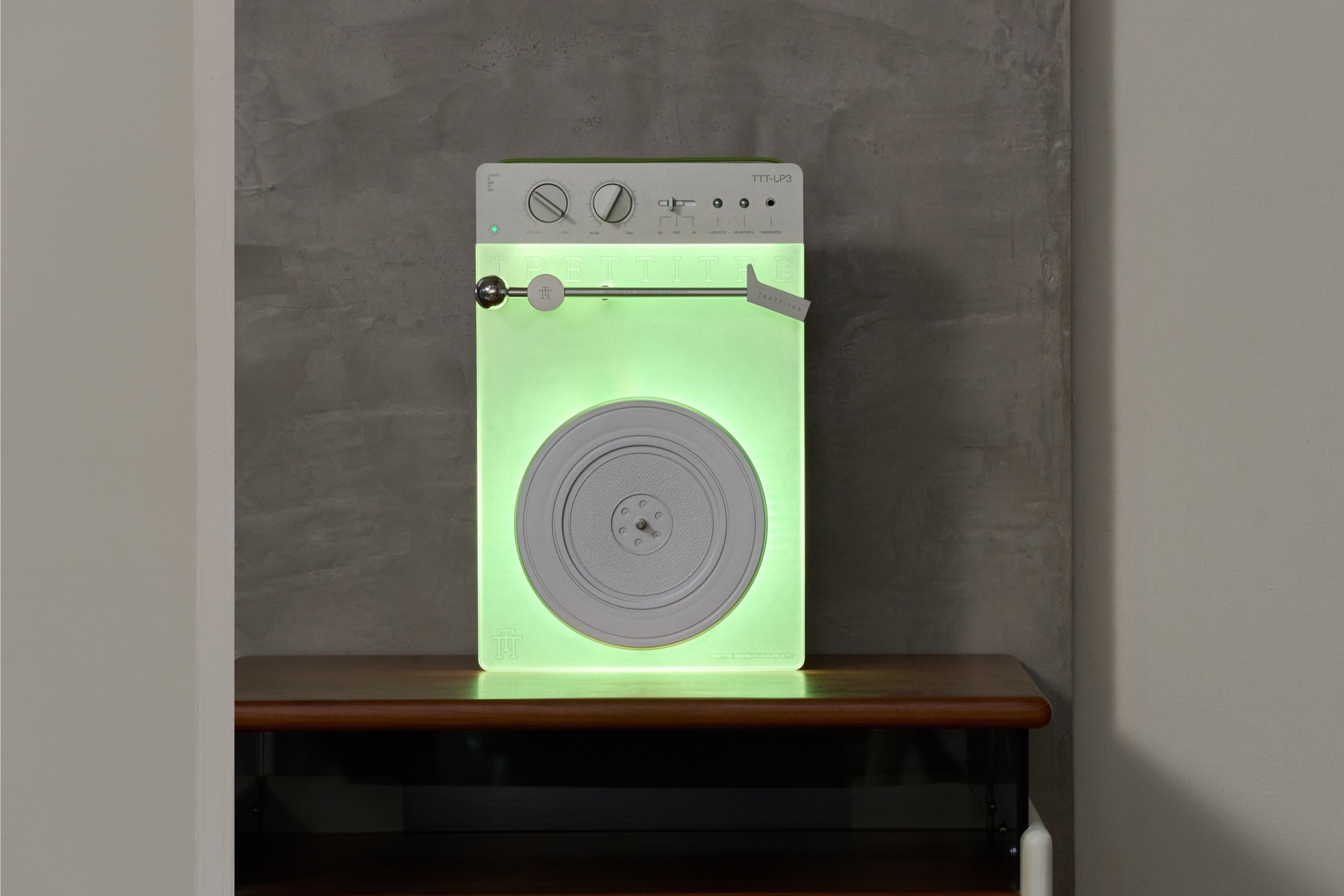 Questo giradischi Trettitre TTT-LP3 è wireless e dotato di batteria. È possibile riprodurre i dischi sia in verticale sul supporto a parete che in orizzontale su un tavolo. Il suono può essere trasmesso in modalità wireless tramite Bluetooth 5.3 a un altoparlante o a delle cuffie, compreso il supporto per Qualcomm aptX HD. In alternativa, è disponibile un jack AUX da 3,5 mm. Il supporto a parete ricarica il lettore e la batteria integrata ha un'autonomia fino a sei ore.