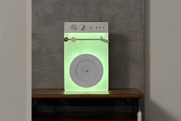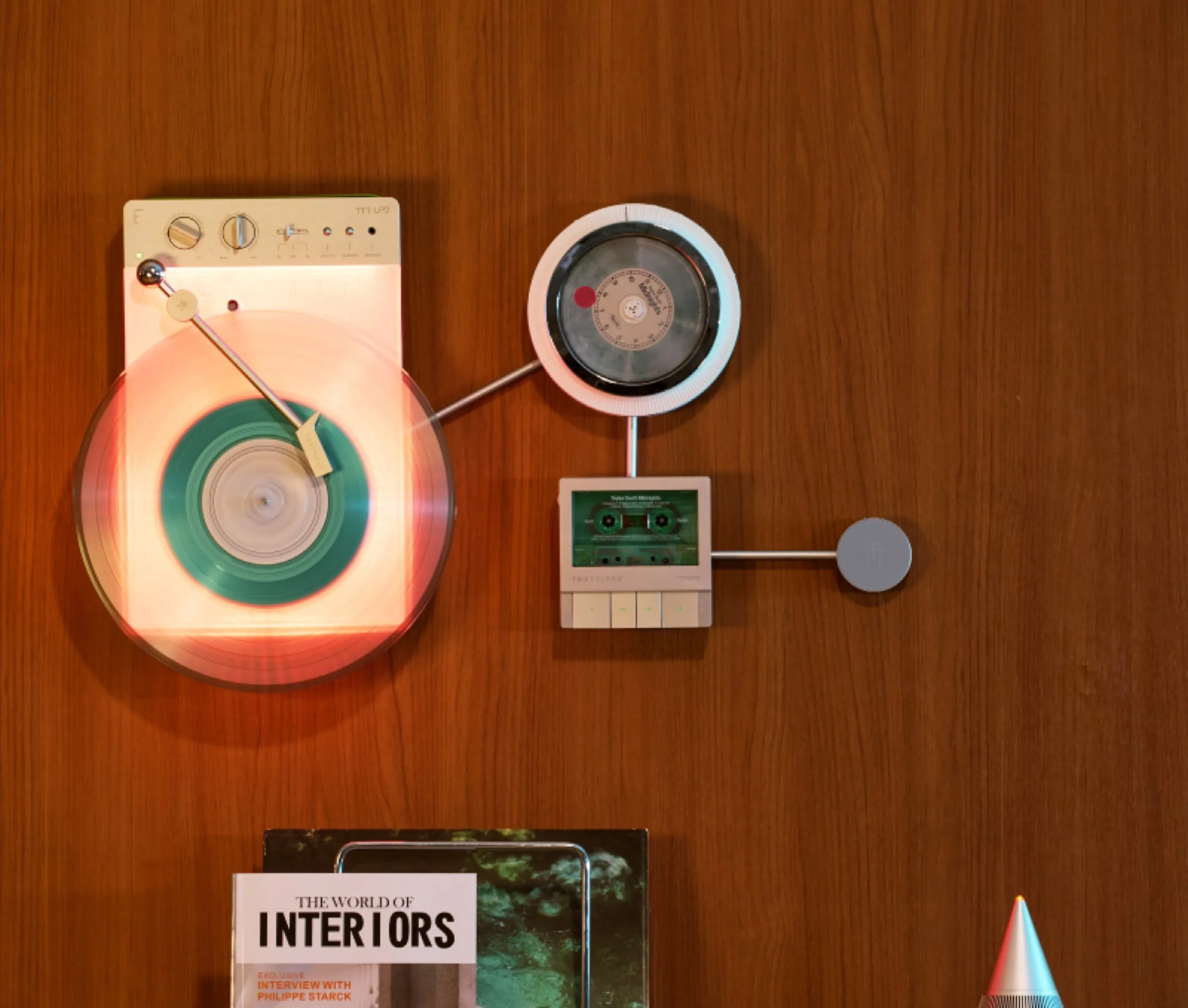 Questo supporto a parete può anche contenere magneticamente uno smartphone come l'iPhone 17 di Apple. Il sistema è composto anche da tre dispositivi di riproduzione che possono riprodurre dischi, CD e cassette compatte. Il lettore di dischi è l'elemento di spicco del design, in quanto presenta una superficie illuminata che mette abilmente in mostra i vinili
