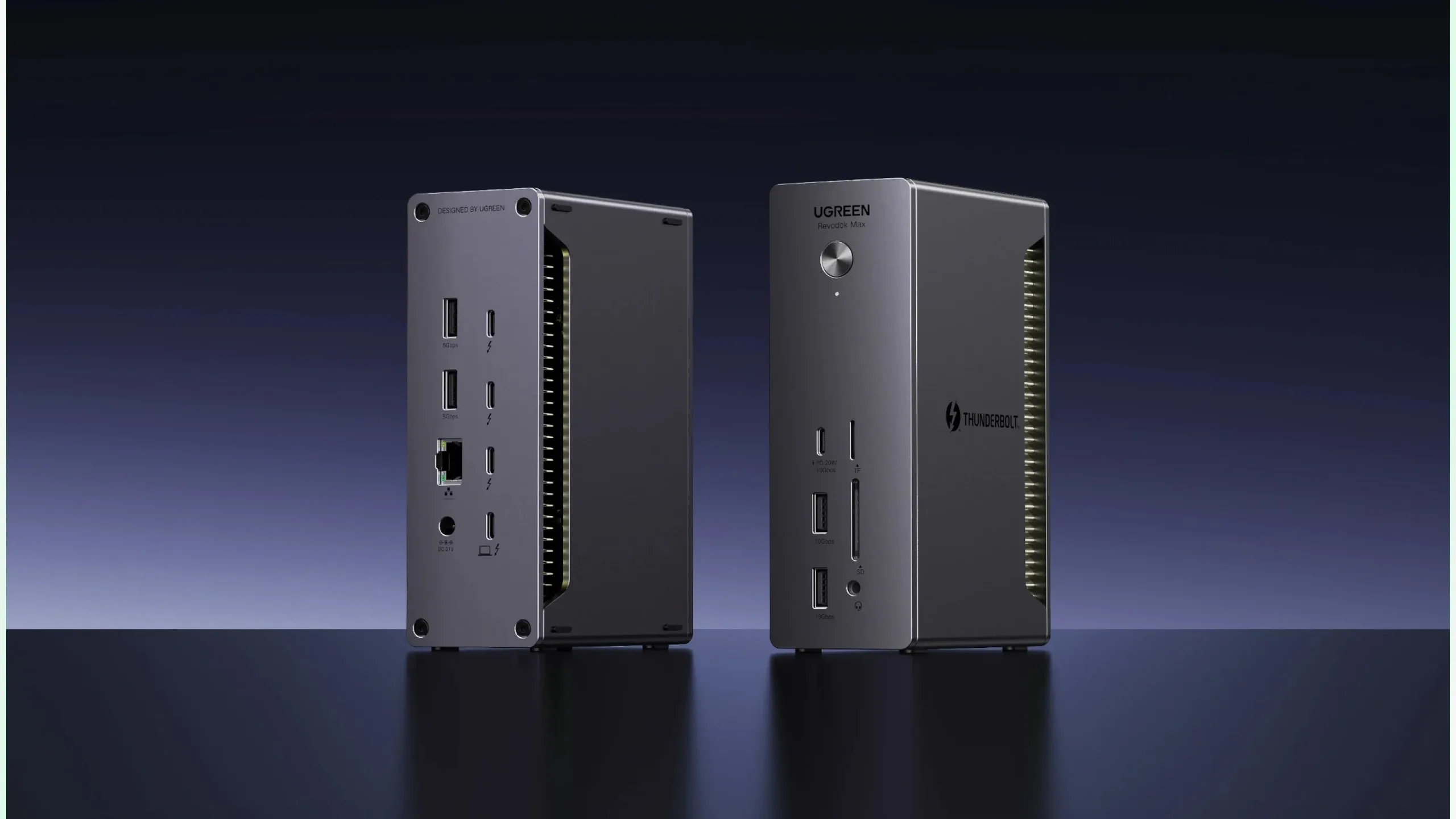 UGREEN inaugurale Thunderbolt 5 Docking Station è stata rivelata con la stessa torre verticale ben ventilata torre verticale come il suo predecessore Revodok Max 213 (attualmente disponibile a 299,99 dollari su Amazon); tuttavia, è valutata per offrire una velocità di trasferimento superiore ai 40 gigabit al secondo (Gb/s) di quell'accessorio velocità di trasferimento.