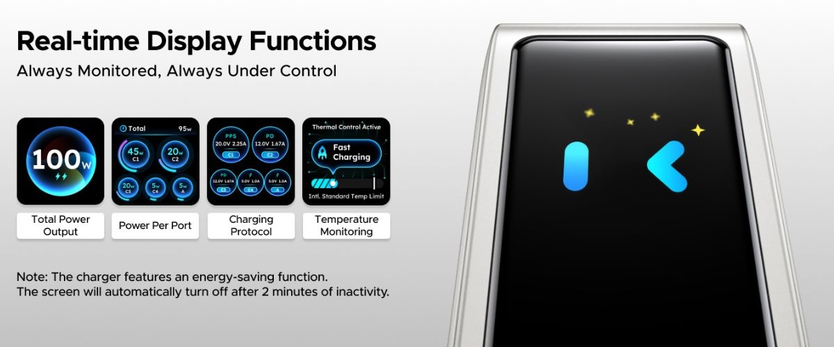 Il caricatore Nexode Pro 100W supporta una serie di protocolli, tra cui PD 3.0, QC 4.0 e PPS. Sul display integrato, gli utenti possono visualizzare le informazioni di ricarica in tempo reale, come la distribuzione della potenza, il/i protocollo/i di ricarica e la temperatura. Inoltre, questo nuovo accessorio Ugreen ha un design pieghevole per renderlo più compatto.