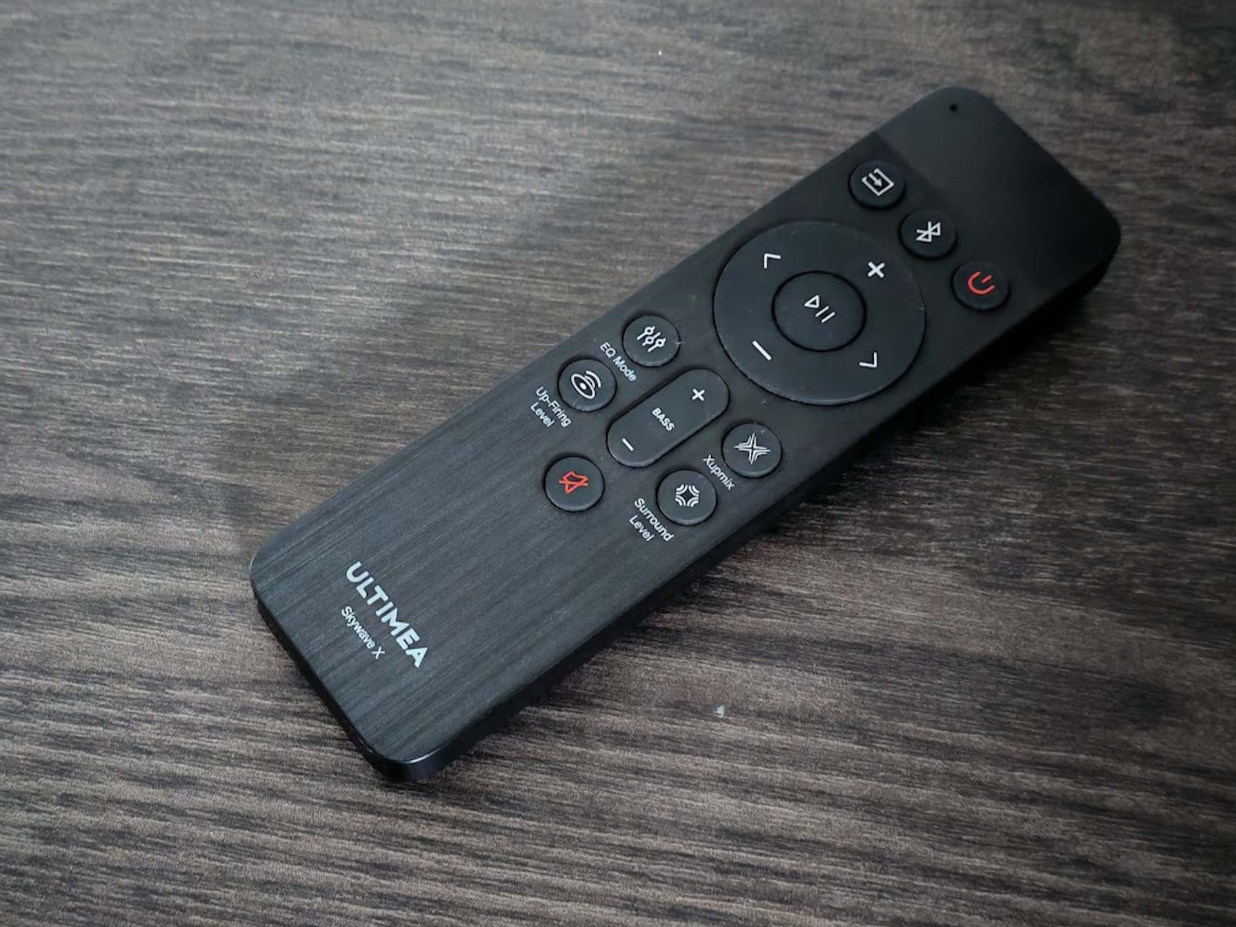 Sulla parte superiore della soundbar si trovano i pulsanti per la selezione della sorgente, l'accensione e lo spegnimento e il controllo del volume. Il telecomando offre le stesse funzioni e comprende anche pulsanti per la selezione rapida dell'equalizzatore, la regolazione dell'intensità dei bassi, la potenza dei driver che sparano verso l'alto, l'effetto surround e l'attivazione di Xupmix. Il telecomando è abbastanza robusto, ma per il resto non è notevole.