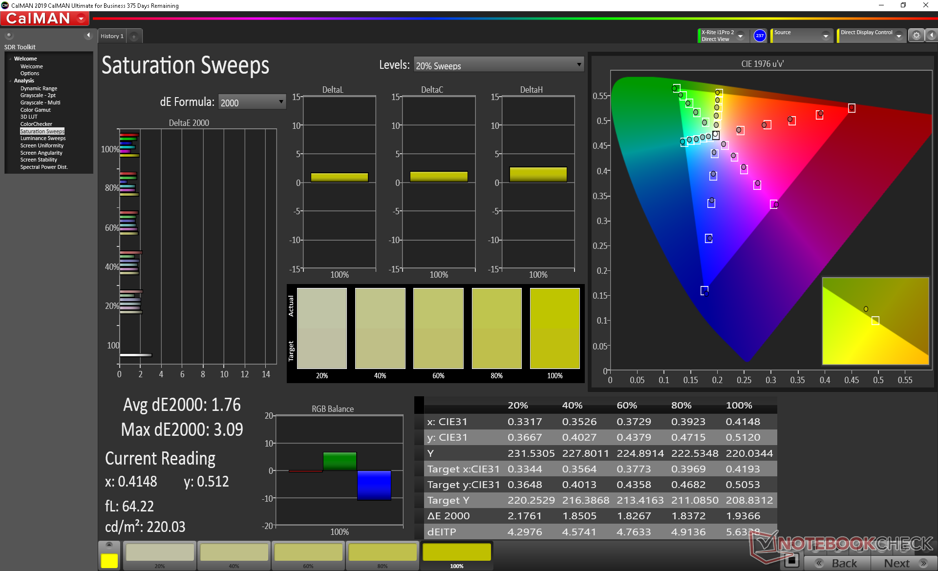 Il pannello è ben calibrato con valori medi di scala di grigi e di colore DeltaE di soli 2,5 e 2,34, rispettivamente. Calibrando noi stessi il display, si migliora solo marginalmente sia la gamma che il bilanciamento RGB.
