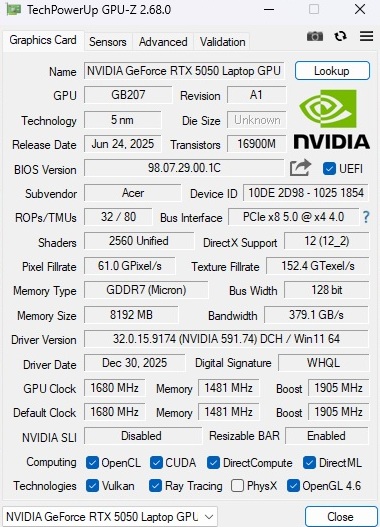 | Acer Nitro V 15 ANV15-52-50S2 i5-13420H, GeForce RTX 5050 Laptop, 76 Wh | Acer Nitro V 15 ANV15-51-582S i5-13420H, GeForce RTX 4050 Laptop GPU, 57 Wh | HP Victus 15-fa2160ng i5-13420H, GeForce RTX 5050 Laptop, 70 Wh | MSI Cyborg 15 B2RWEKG Core 7 240H, GeForce RTX 5050 Laptop, 55.2 Wh | Lenovo LOQ 15AHP10 R7 250, GeForce RTX 5060 Laptop, 60 Wh | Lenovo Legion 5 15AHP G10 R7 260, GeForce RTX 5060 Laptop, 80 Wh | Media della classe Gaming | |
