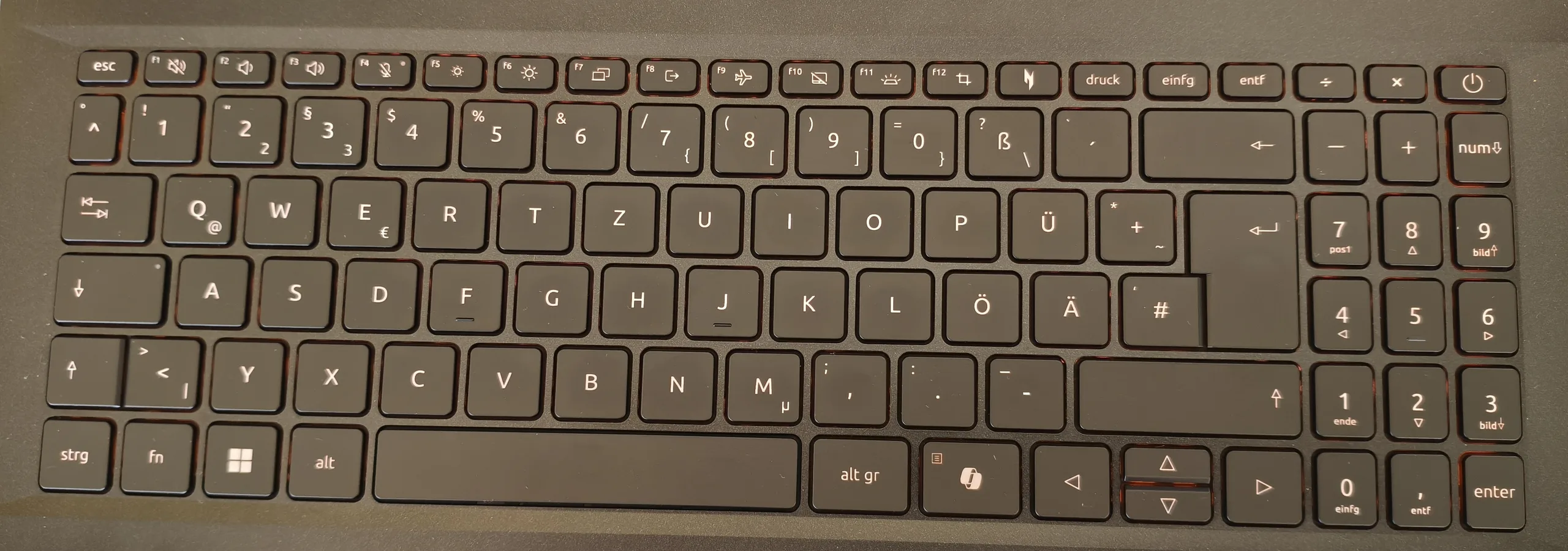 Non siamo rimasti del tutto soddisfatti del layout della tastiera. I punti critici includono il tastierino numerico a tre colonne invece di un layout completo a quattro colonne, così come i tasti freccia centrali piuttosto piccoli. L'esperienza di digitazione è tipica della cupola di gomma e quindi non è nulla di particolarmente notevole. C'è spazio per migliorare anche la retroilluminazione. L'illuminazione arancione non è particolarmente brillante, anche con l'impostazione più alta. Il lato positivo è che il portatile da 15 pollici è dotato di un touchpad abbastanza grande, che misura 12,6 x 7,8 cm, anche se si sente un po' di rumore quando si fa clic.
