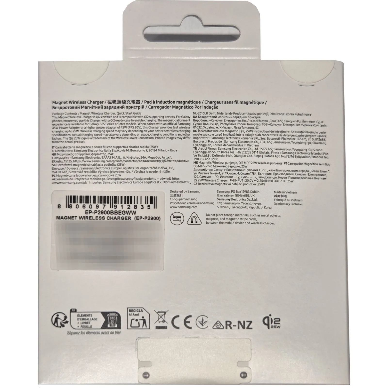 Il connettore USB-C reca il logo "Qi2 25W" e la confezione conferma anche che il caricatore supporta la versione attuale dello standard Qi2. Ciò consente di caricare in modalità wireless gli smartphone compatibili fino a 25 watt. Questo include l'iPhone 17 di Apple, mentre il Galaxy S25 può essere caricato solo fino a 15 watt a causa di una limitazione dello smartphone, non del caricatore. Sul retro della confezione si legge anche che l'uso con gli smartphone Samsung Galaxy è possibile solo se si utilizza una custodia protettiva con magneti compatibile con Qi2.