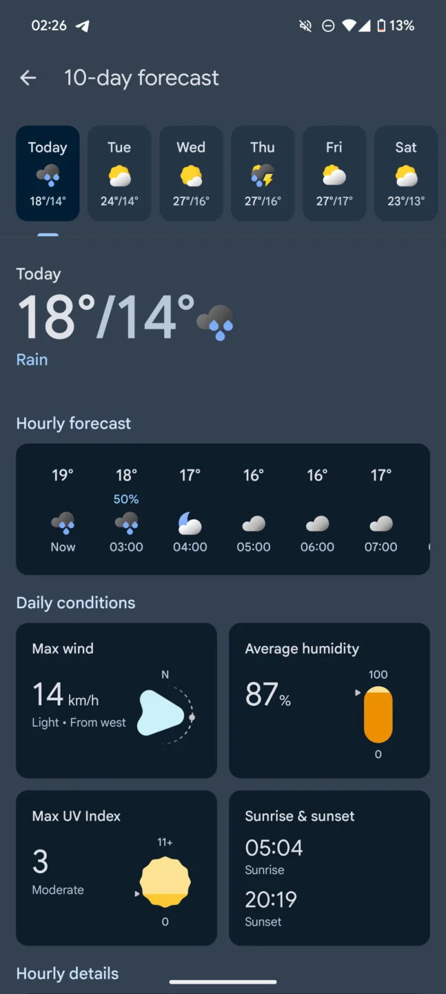 Si prega di notare che gli screenshot qui sotto provengono da una 'versione non definitiva dell'app'. Pertanto, Google potrebbe integrare delle modifiche prima di distribuire l'app pubblicamente. Per il momento, tuttavia, sembra che l'app Pixel Weather passerà a un look più minimalista, rinunciando alla rana del meteo che è attualmente presente nel riquadro meteo dell'app Google. Inoltre, Google ha rimosso la notifica del meteorologo che si trovava sopra le previsioni orarie. Per maggiori informazioni, consulti gli screenshot qui sotto.