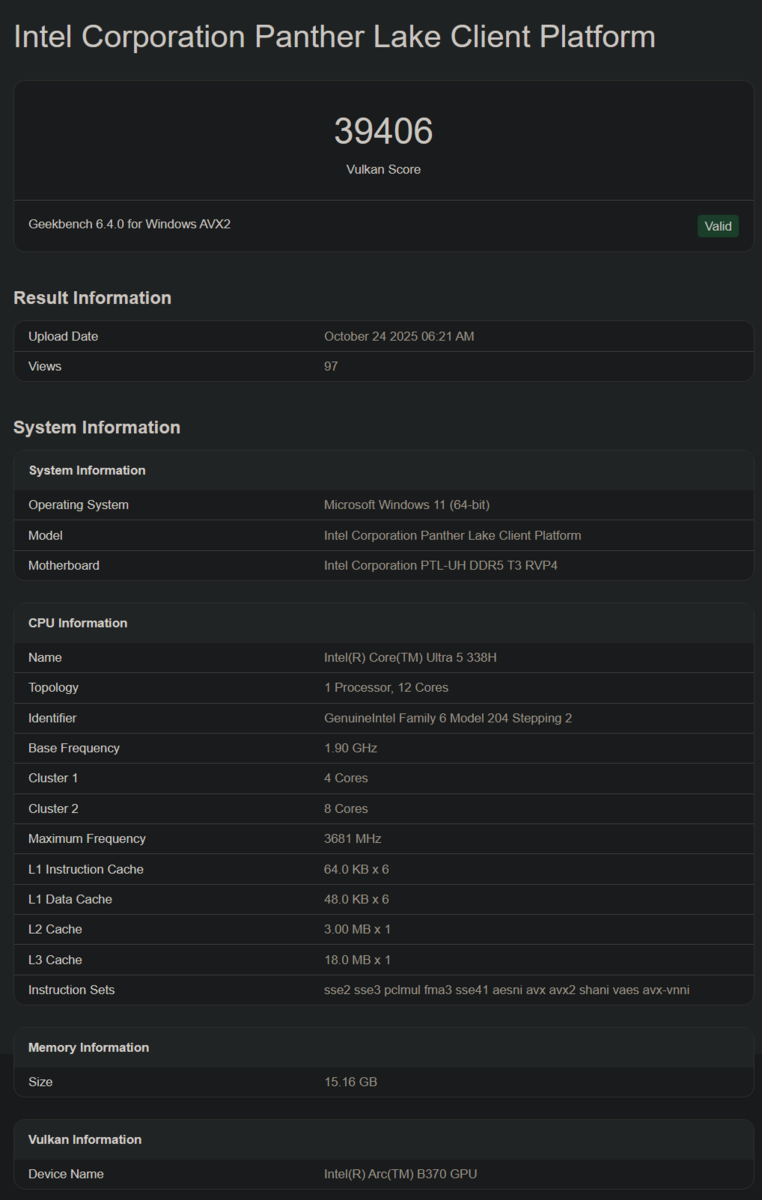 Tuttavia, l'Arc B370 qui ottiene un punteggio di 39.406 nel benchmark Vulkan di Geekbench. Il suo predecessore, l' Arc 130Vottiene un punteggio di 27.209 nello stesso benchmark, il che lo rende circa il 45% più veloce. Questa cifra è vicina all'aumento delle prestazioni del 50% pubblicizzato da Intel per le iGPU Panther Lake.