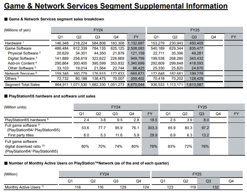 L'azienda ha anche riportato 132 milioni di utenti attivi mensili su PlayStation Network al 31 dicembre 2025. Questo numero è aumentato di tre milioni rispetto allo stesso periodo dell'anno fiscale precedente.