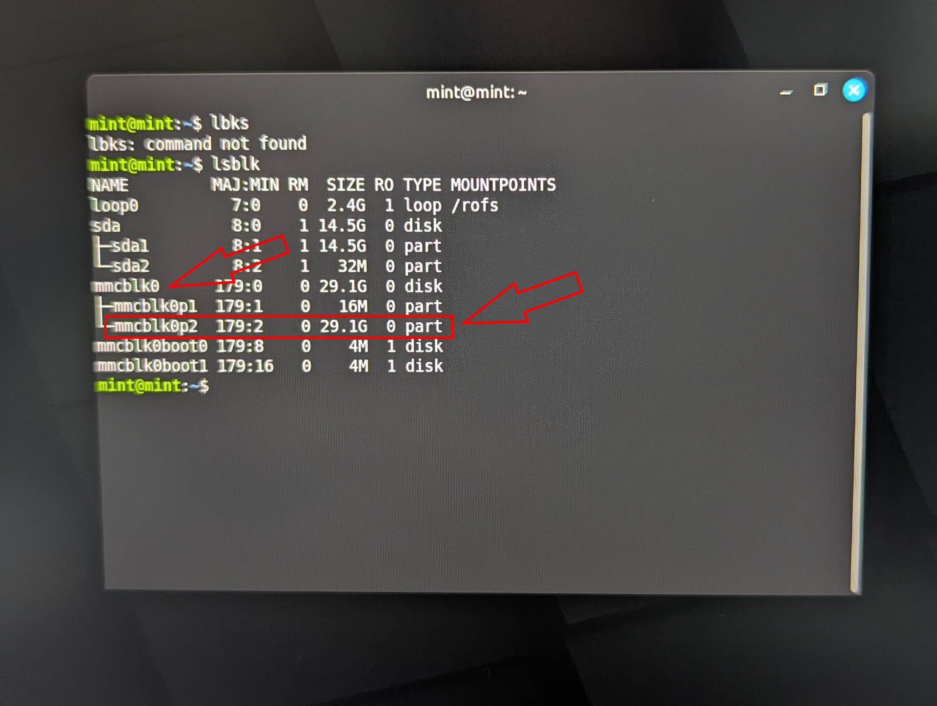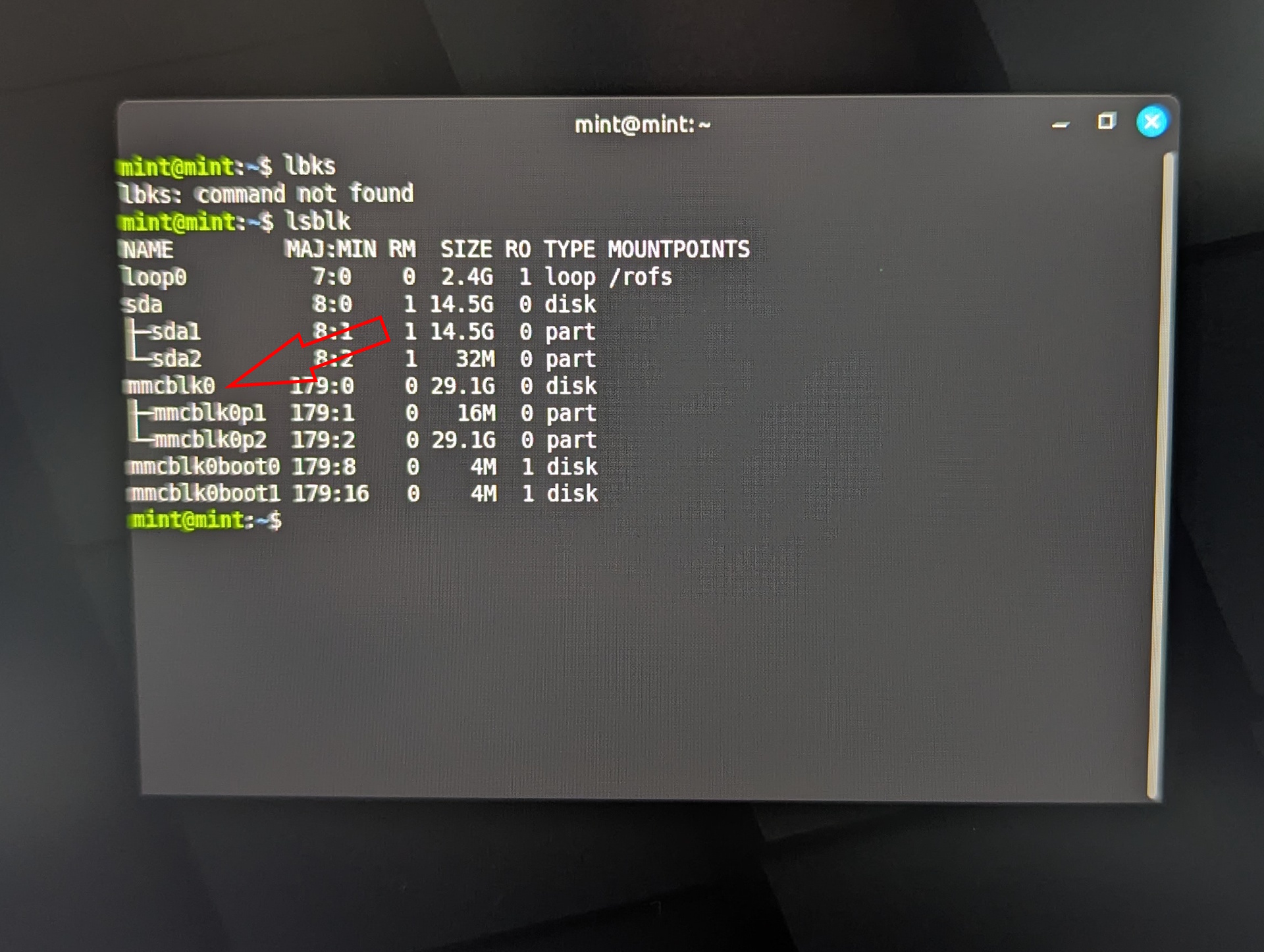 Questo comando elenca tutti i dispositivi di archiviazione. La memoria interna eMMC appare come mmcblk. Su altri sistemi x86, il nome potrebbe essere diverso. Le unità USB di solito appaiono come sda, sdb e così via.