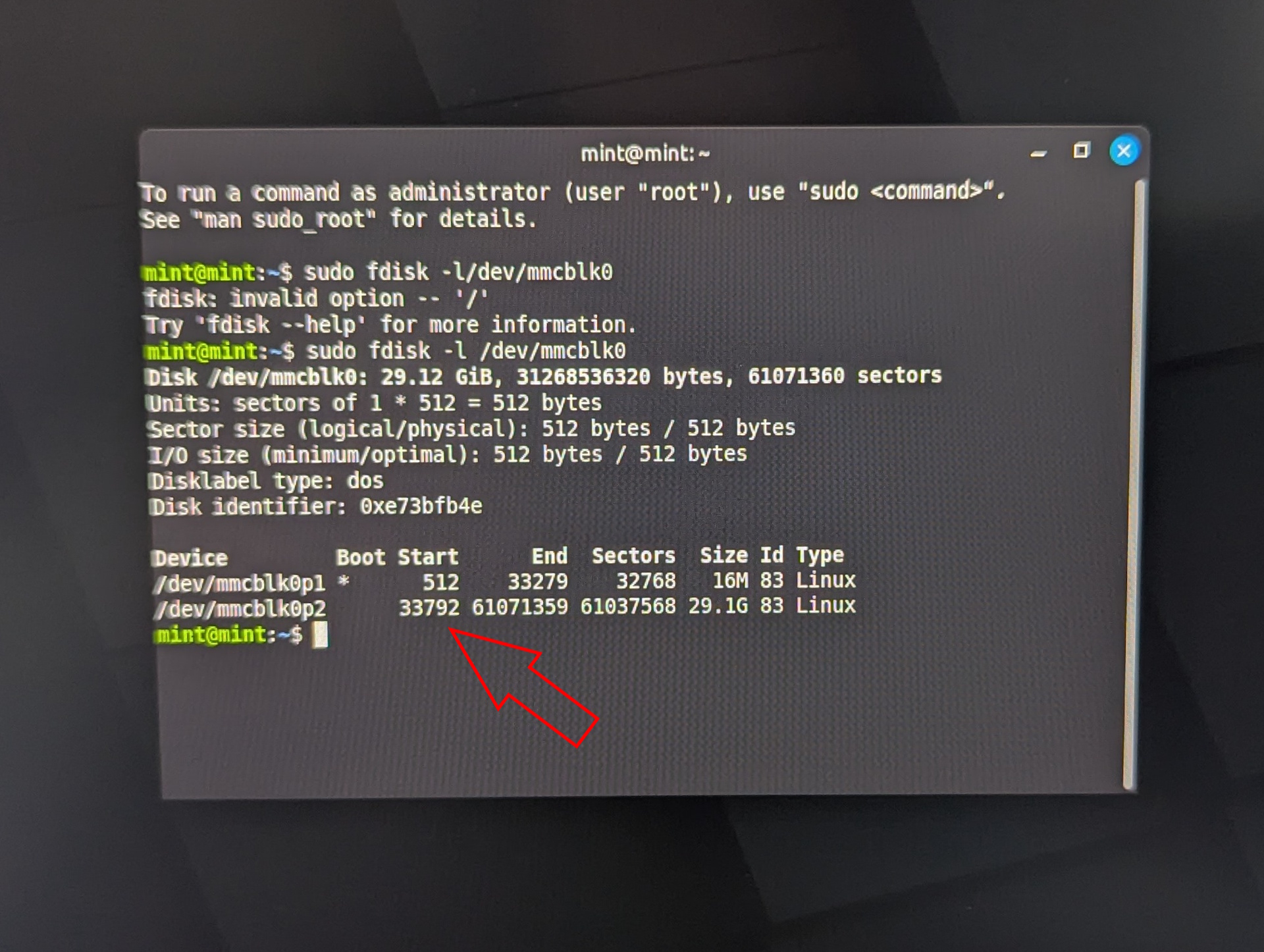 Trovi la voce: mmcblk0p2. Si tratta della seconda partizione. Noti il valore del settore iniziale (predefinito: 33792). Questo è fondamentale, perché l'inserimento di un valore sbagliato potrebbe distruggere la partizione di avvio.