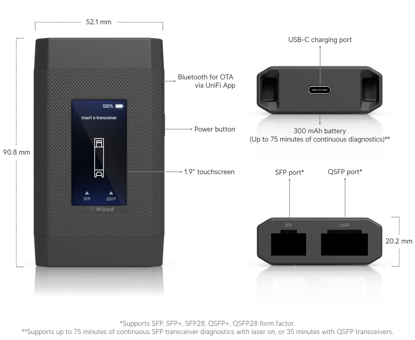 Il dispositivo consente agli utenti di preparare i moduli SFP e QSFP più grandi per utilizzarli con altri switch. Per farlo, SFP Wizard include due slot per moduli di dimensioni corrispondenti. Secondo Ubiquiti, la sua batteria da 1,1Wh ha un'autonomia di 75 minuti senza alimentazione esterna. Il touchscreen può essere pratico durante la programmazione del modulo. Misurando circa 2 x 3,5 pollici e pesando 3 once, il dispositivo è abbastanza compatto da entrare nella maggior parte delle tasche.