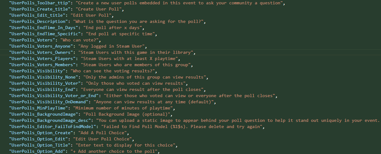 Le etichette di testo descrivono un flusso di lavoro completo per il sondaggio: gli autori possono impostare un orario di fine "dopo x giorni" o in un momento specifico e definire chi può votare, tra cui "qualsiasi utente Steam connesso", "utenti Steam con questo gioco nella loro libreria", "utenti Steam con almeno X ore di gioco" o "membri di questo gruppo". Ci sono dei toggle di visibilità dei risultati come "solo gli amministratori di questo gruppo possono visualizzare i risultati", "solo coloro che hanno votato possono visualizzare i risultati" o "tutti possono visualizzare i risultati dopo la chiusura del sondaggio", oltre a un'opzione "on-demand" che implica che le pagine dei risultati possono essere aperte in qualsiasi momento dagli spettatori autorizzati. Altre etichette hanno un requisito minimo di tempo di gioco, un'immagine di sfondo per il sondaggio e la creazione di scelte standard come "Aggiungi una scelta del sondaggio" e "Modifica la scelta del sondaggio dell'utente", che probabilmente si riferisce ad un editor templato piuttosto che a modifiche ad hoc del forum.