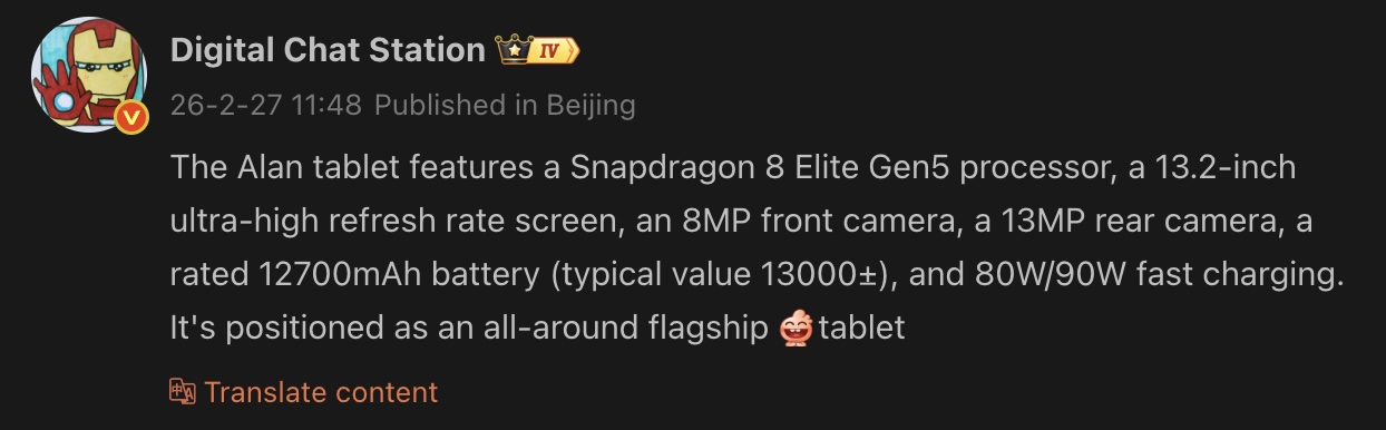 Inoltre, la fuga di notizie indica una fotocamera posteriore da 13MP e una fotocamera selfie da 8MP. Potrebbe essere alimentato dallo Snapdragon 8 Elite Gen 5che è l'ultimo processore di punta di Qualcomm. Si dice che Vivo Pad 6 Pro sia dotato di una batteria da 13.000 mAh, rispetto ai 12.050 mAh del suo predecessore. Potrebbe anche supportare la ricarica rapida fino a 90W (powerbank Iniu da 10K , al momento 20 dollari su Amazon).