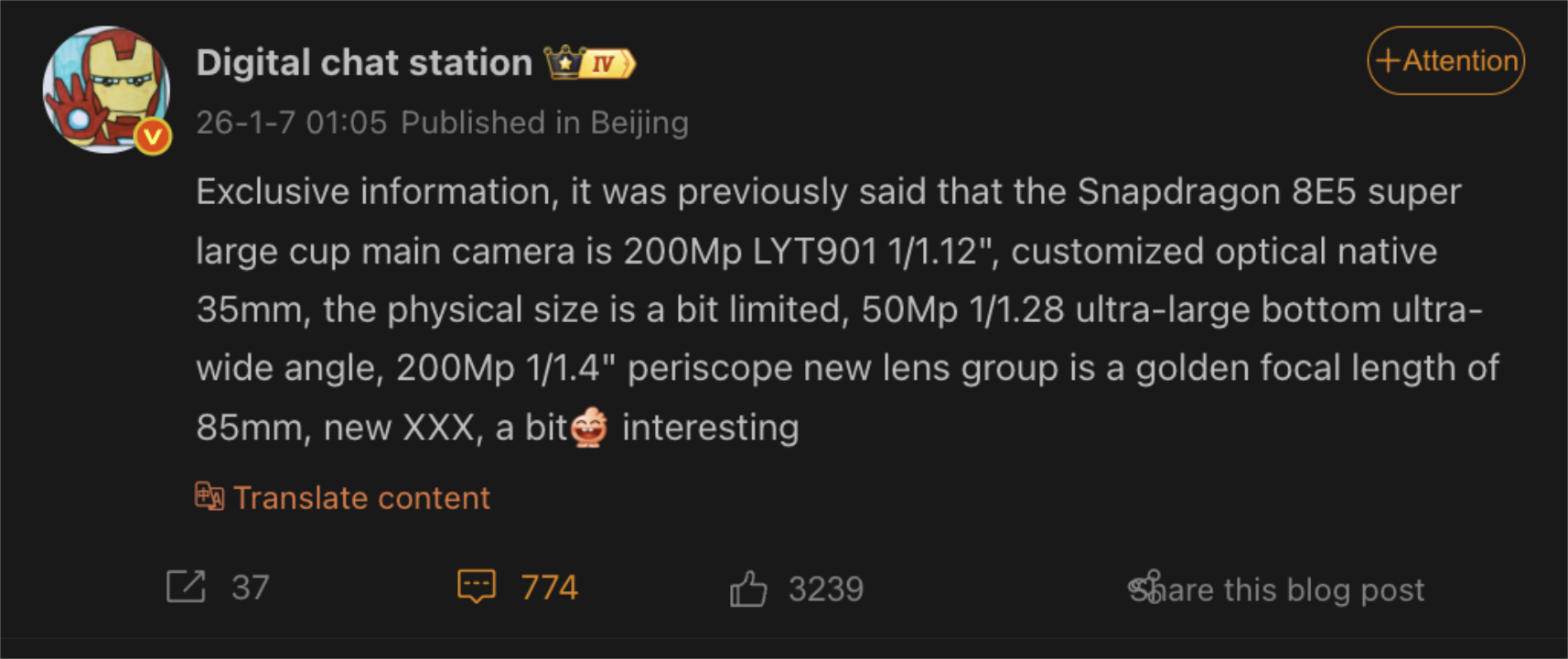 Scrivendo su Weibo, lo stesso leaker ribadisce che l'X300 Ultra si unirà al Galaxy S26 Ultra e all'OnePlus 15 nell'adozione del sistema Qualcomm Snapdragon 8 Elite Gen 5 di Qualcomm. Inoltre, scrive che il seguente hardware della fotocamera rimane pianificato: