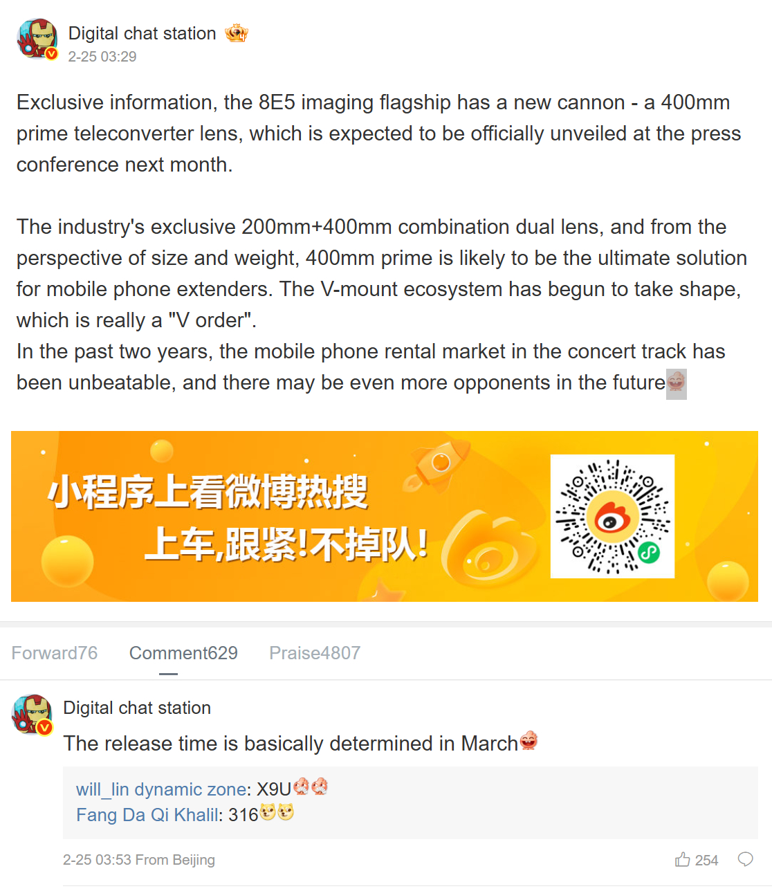 Inoltre, Digital Chat Station ha suggerito che Vivo X300 Ultra sarà affiancato da un nuovo accessorio teleconvertitore che consente di ottenere due lunghezze focali equivalenti. Scrivendo su Weibo, il leaker afferma che l'accessorio supporterà le modalità 200 mm e 400 mm per integrare il previsto teleobiettivo da 85 mm incluso nella X300 Ultra.